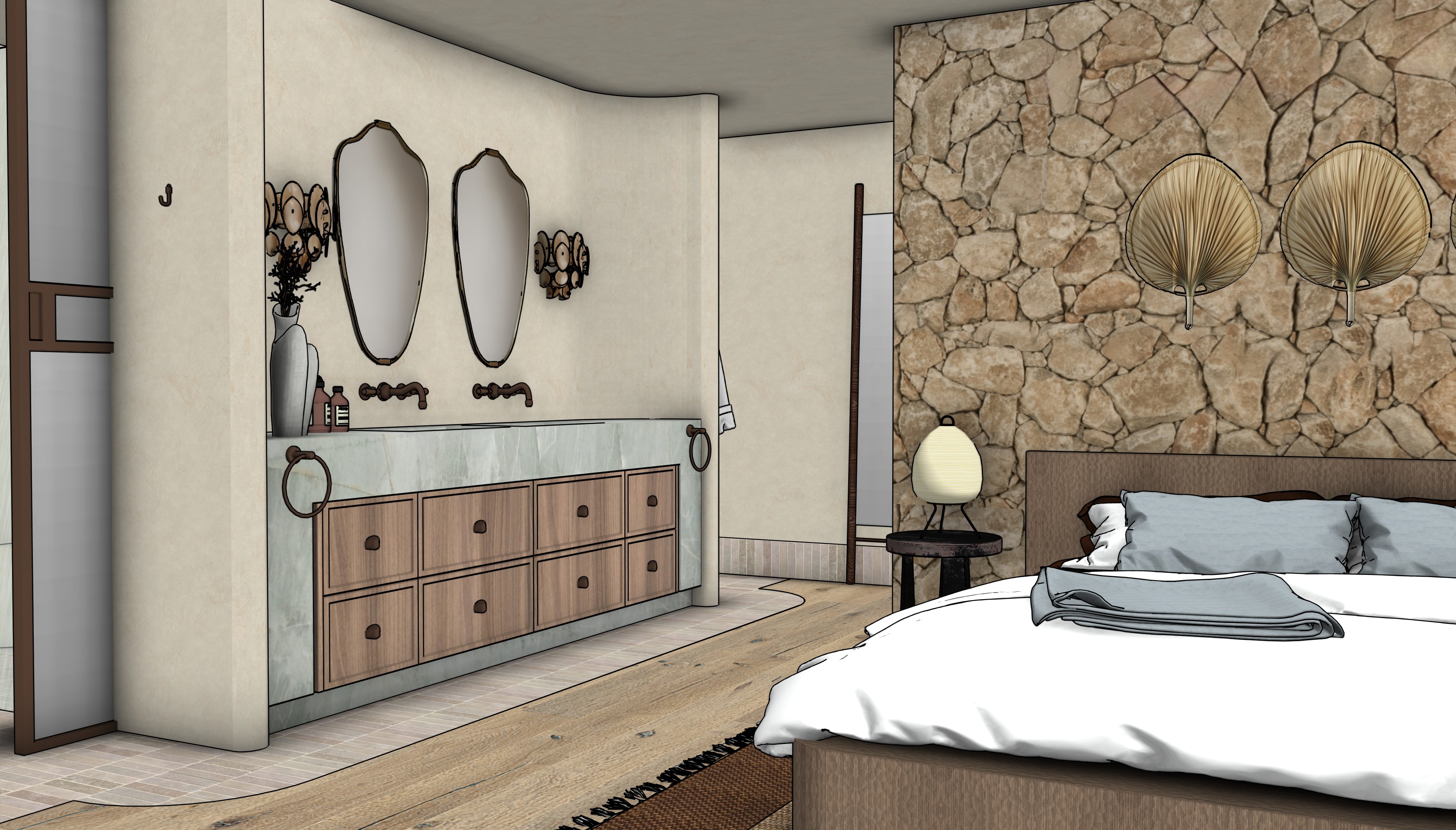 walls and ceiling are warm off white limewash vanity stone is soft muted light emerald quartzite vanity cabinetry is a soft muted mid tone timber not dark not light bed head wall is a freeform stone cladding golden hour