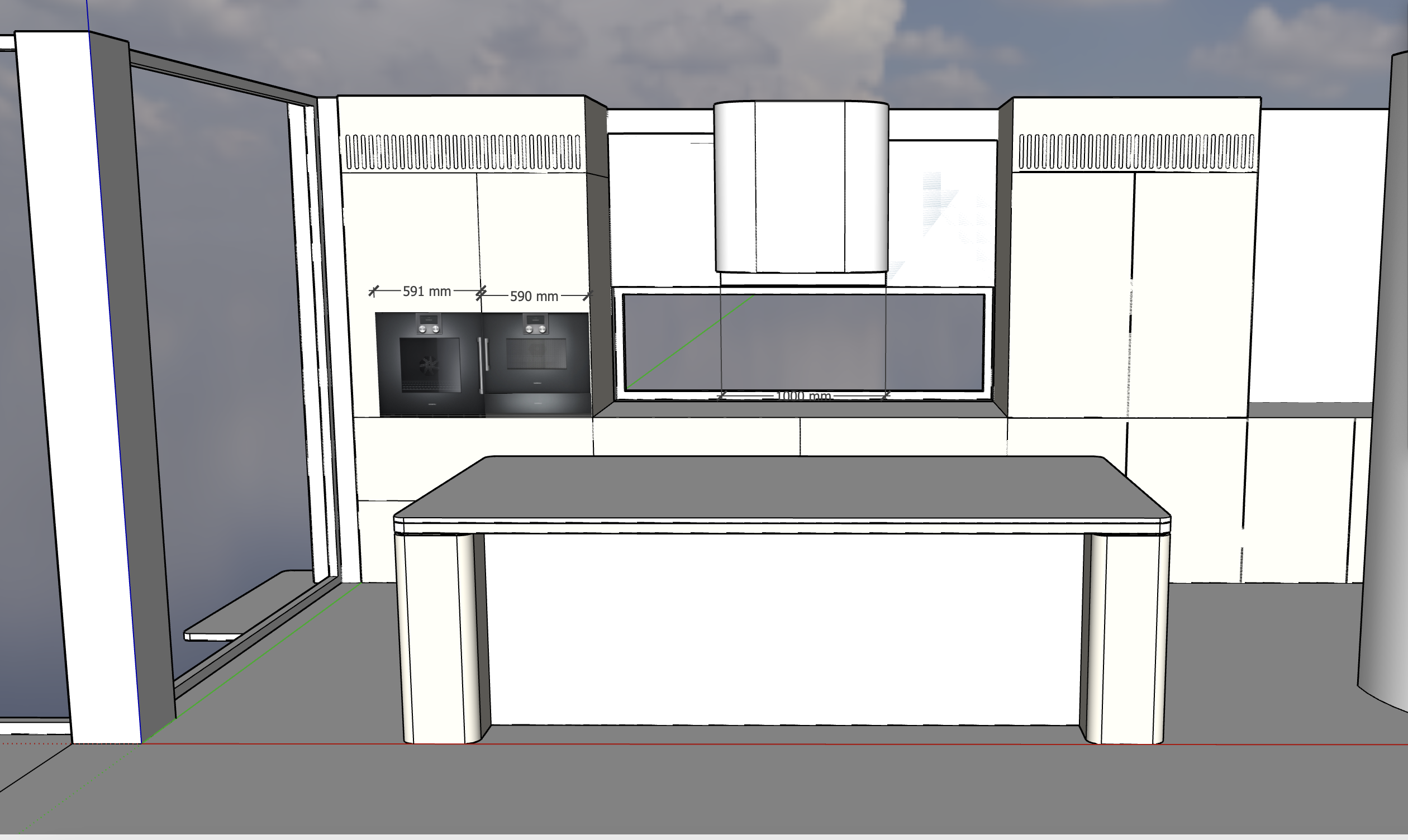 modern exterior shot render a modern kitchen with sleek white oak cabinetry and a metallic black oven the countertop should be a smooth elegant taj mahal stone the walls are a pristine white in microcement with large glass windows allowing natural light to fill the space a microcemented range hood is featured above a glossy black stove the atmosphere is bright and airy with subtle hints of modern elegance and clarity the window on the outside shows a pool up against the window while the read splashback glass shows a timber paling fence architecture