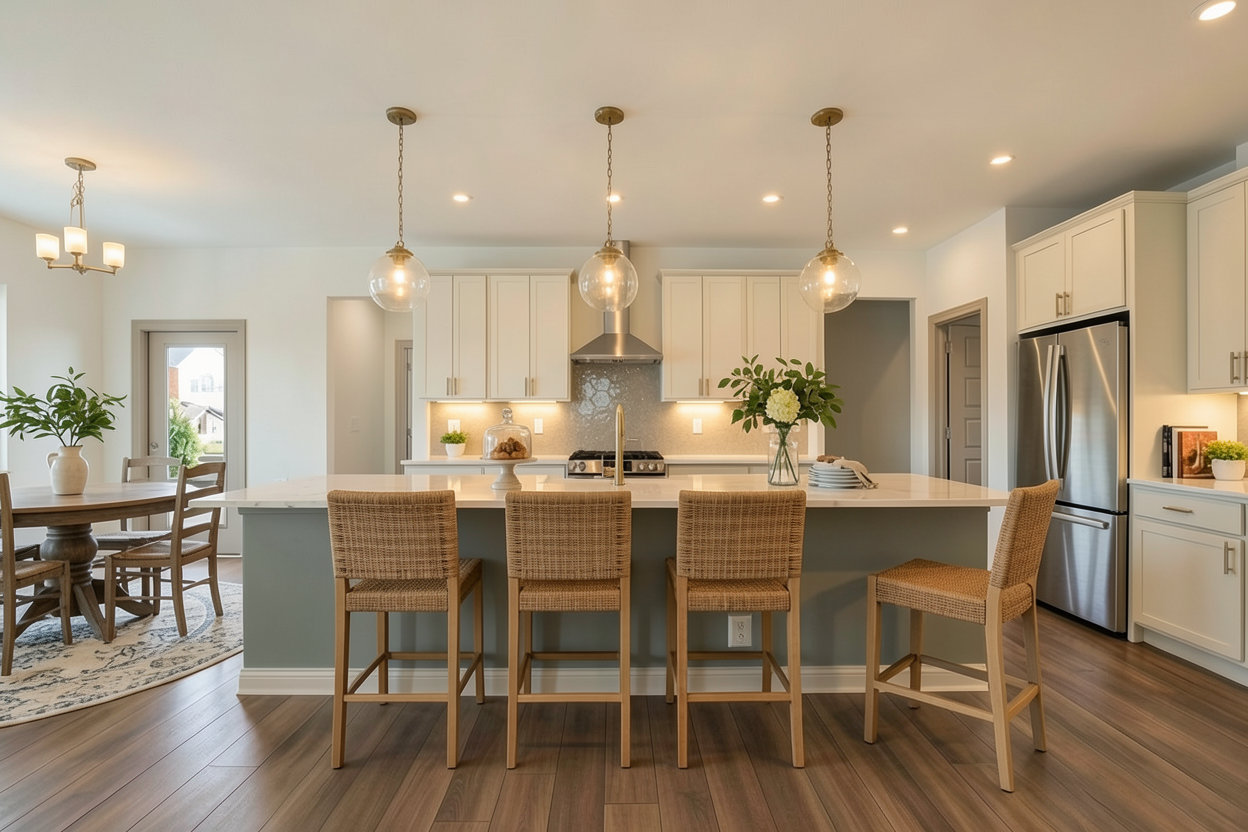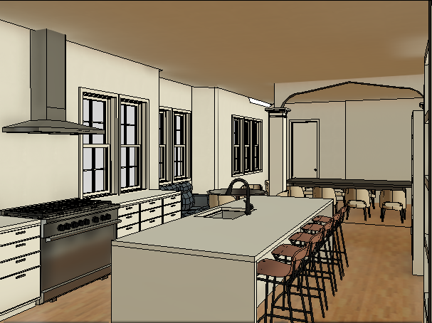 follow original floor plan add decorative white wood surround on exhaust hood extend arch to window wall make dining table larger