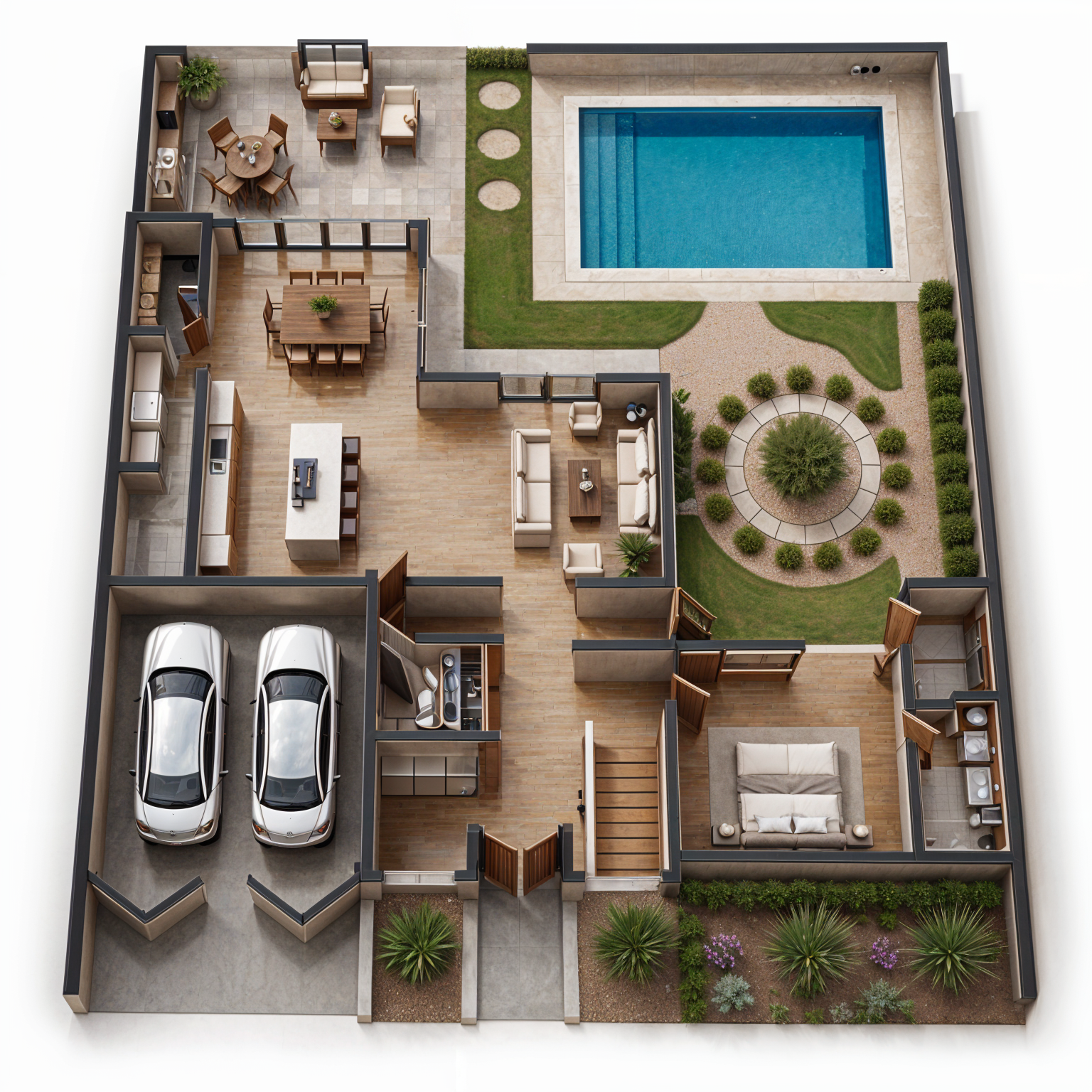 create a rendered view but take 2 steps to the left and look towards the cabinets remove dining furniture add recessed lighting