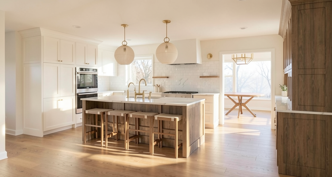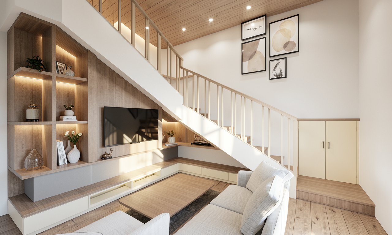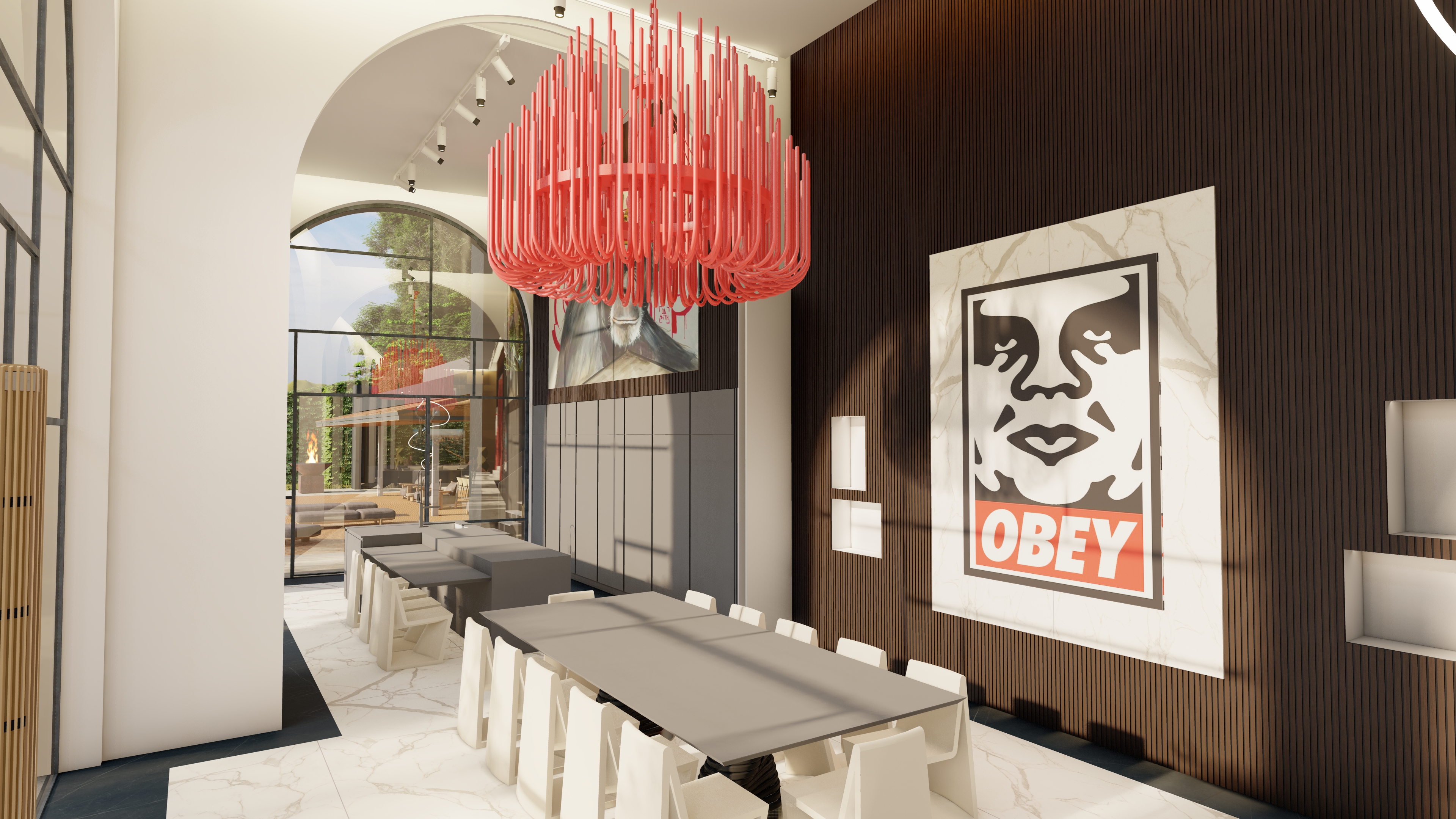 make the view hyper realistic enhance the reflections but do not alter the textures and the images of the paintings improve the lighting to create a golden hour effect turn on the led profiles along the ceiling edges with warm light only