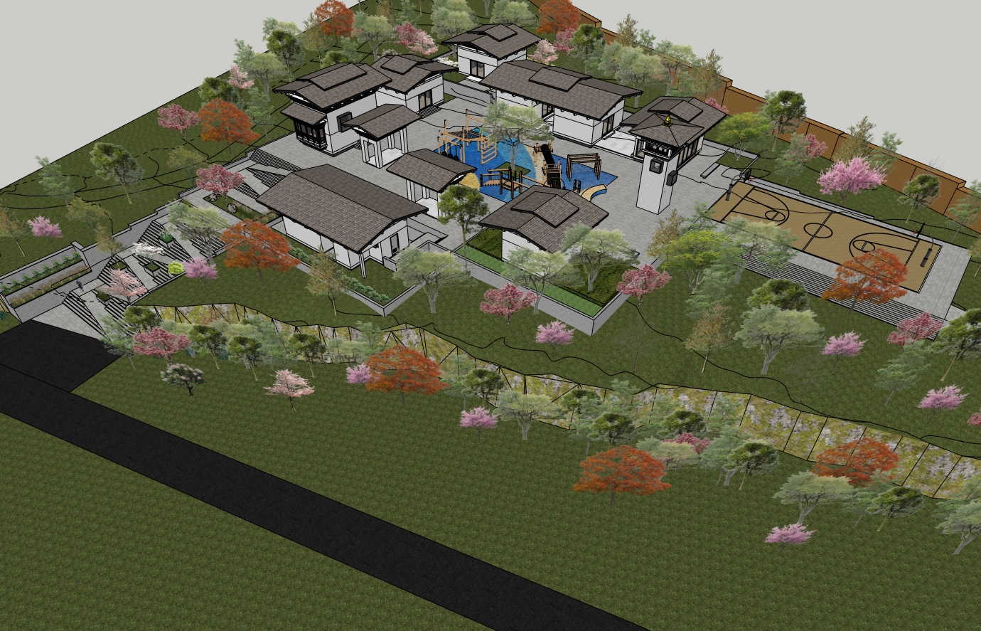 render this exterior sketchup model as a photorealistic landscape visualization matching the mood brightness and atmosphere of the cherry blossom reference photo apply the following sky lighting replace the flat grey sky with a soft clear pale blue spring sky bright airy and clean as seen in the reference lighting should be gentle diffused daylight soft shadows no harsh contrast overall scene brightness should be elevated and luminous light fresh and ethereal not dark or heavy cherry blossom trees replace all existing pink and flowering trees throughout the composition with full bloom japanese cherry blossom trees sakura the blossom colour should be a delicate soft pink to blush white exactly as in the reference photo densely layered cloud like canopies of fine petals trees should feel abundant and enveloping lining both sides of the central axis and flanking the architecture foreground ground replace the dark black pathway with a light warm grey stone or pale granite surface softly lit the lawn areas should be a fresh spring green bright and well lit scatter fallen cherry blossom petals lightly across the ground and steps to enhance the seasonal mood water feature if applicable if a reflective pool or water body can be introduced at the foreground add a still mirror like reflection of the cherry blossoms and sky referencing the tranquil pond reflection in the reference photo architecture retain all existing building forms rooflines terraces and staircase layout exactly as modeled render facade materials in light warm stone or off white plaster to complement the soft pink blossom palette dark roof elements may remain as contrast overall mood soft poetic japanese spring garden quiet luminous and romantic reference hirosaki castle cherry blossom park japan photographic quality wide landscape composition there is no water