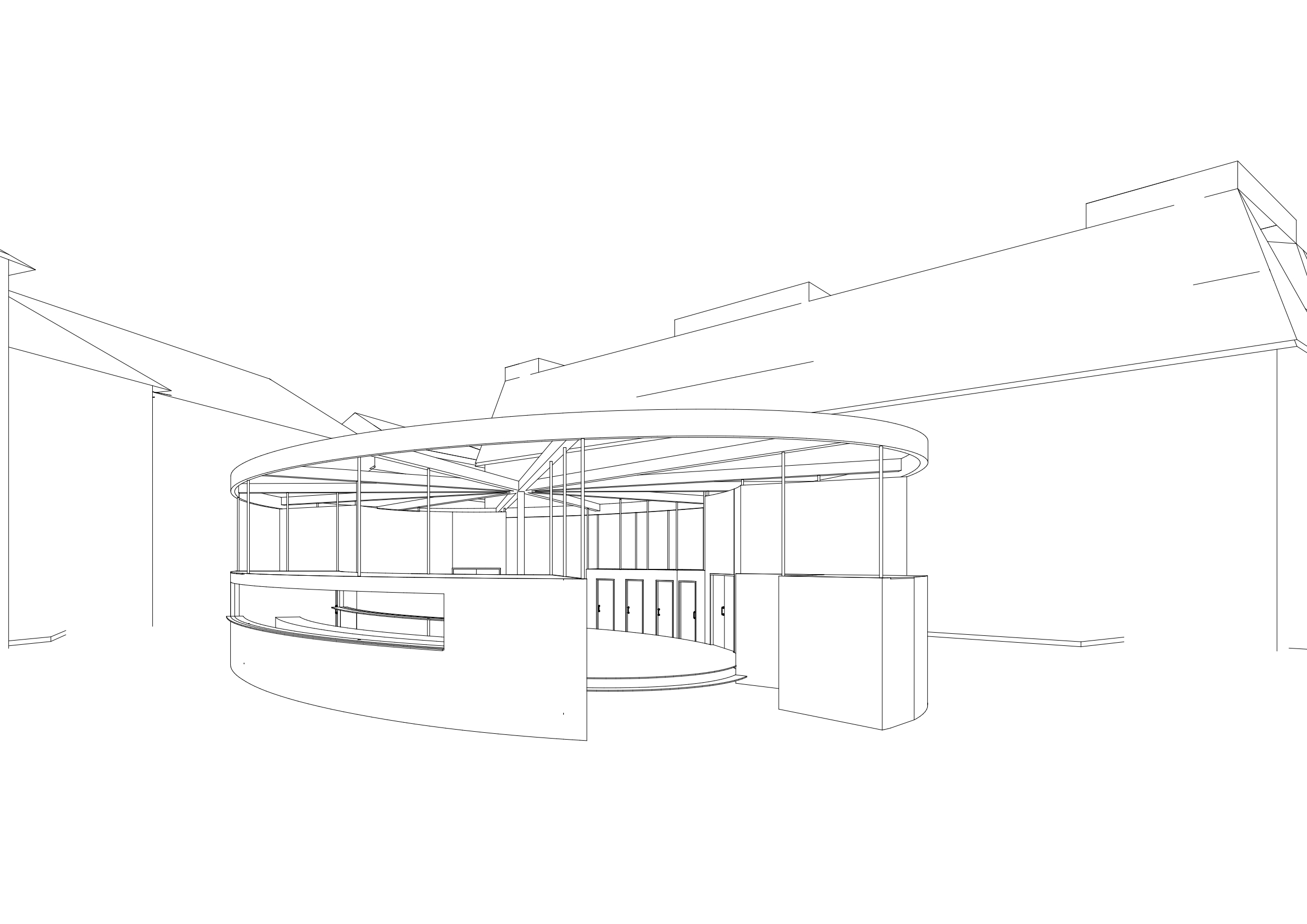 the builiding is on wood panels there is a bar that is made out of dark metal in the middle of the pavillion there is a tree like structure that revolts around the main pole the place outside of the pavillion in the place du chateau in lausanne it is the dance season and it is filled with people