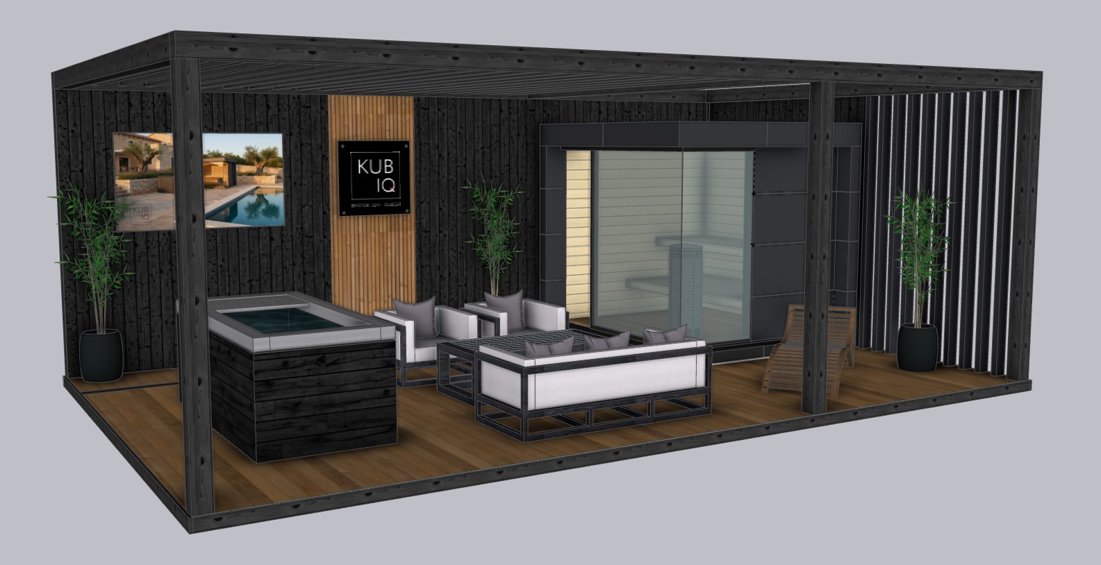archsynth prompt render iz postoje eg 3d modela photorealistic product render of the provided exhibition booth model critical keep 100 of the existing geometry proportions camera perspective object positions and all existing materials textures exactly as in the model do not redesign do not replace materials do not add or remove any elements furniture plants signage or screens render goal premium clean high end eclipse black booth look with realistic light shadows and reflections while preserving original materials charred black wood walls and structure wood decking floor dark modular sauna volume with glass lounge furniture hot tub plants vertical slats lighting realistic soft studio hdri style illumination subtle directional key soft fill natural contrast crisp but not harsh shadows accurate glass reflections refractions realistic metal specular highlights correct ambient occlusion in corners and under furniture output isolated object cutout render no background no environment no sky no ground plane beyond the booth itself transparent background alpha if possible otherwise pure flat white or pure flat neutral gray background with no gradients and no shadows outside the booth footprint quality ultra detailed sharp high resolution physically based rendering clean edges no noise no blur no stylization no cartoon anime no lens distortion