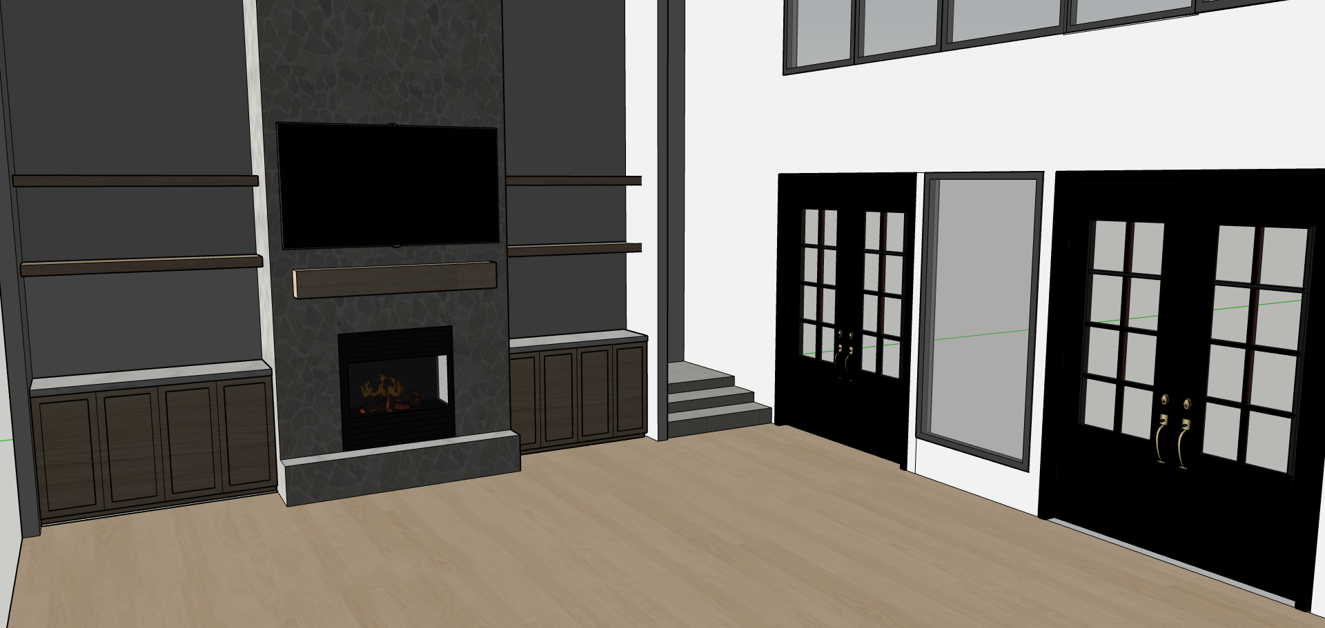 add summer and green landscaping in the windows no plants behind fireplace that is a wall not a window