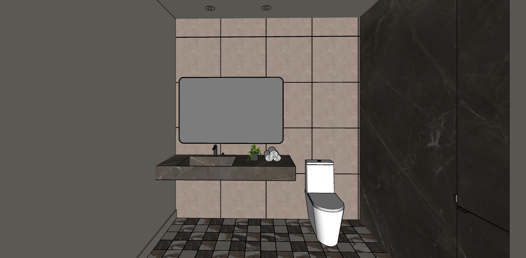 creer un rendu photorealiste le fini au mur a droite est la reference aeterna anatolia pietra imperiale la vanit est en fini pietra imperiale aussi la robineterie est noire conserver le savon aesop a droite du robinet pale exactement comme sur l image de base les ceramiques au plancher sont une mosaique de aeterna anatolia pietra imperiale taj mahal lithoform crosscut organic matte et gemma bronze en format 6 x6 le mur du fond derriere la vanit est en ceramique ceragres lithos taupe satin en 24 x24 le reste des murs et plafond est blanc la toilette est blanche meme le top ne rien modifier du reste de l image