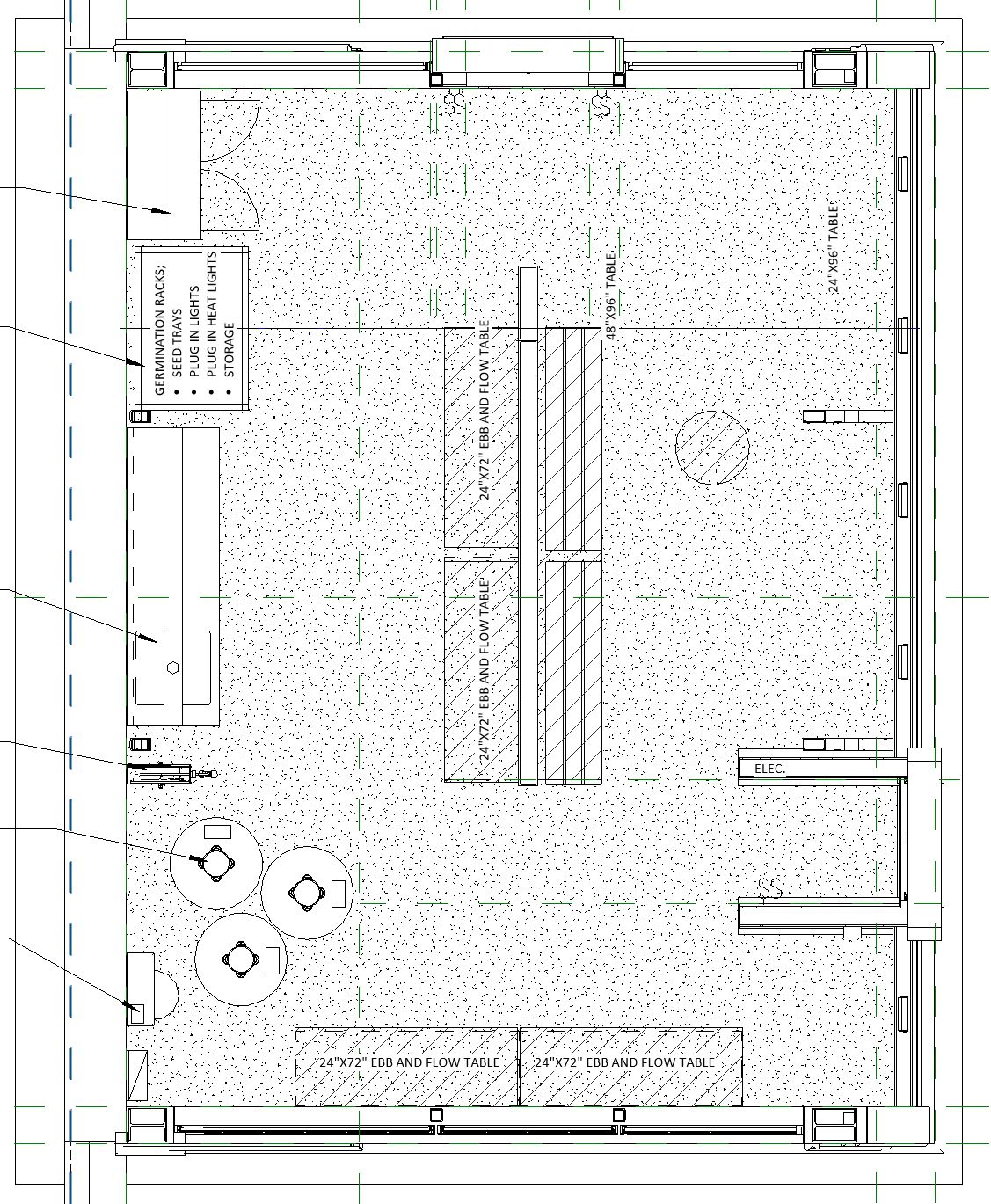 rendered floor plan a greenhouse layout with a concrete floor light washes in through the glass side walls with muntin grids the center tables are hydroponic ebb and flow systems with small potted plants around the perimeter many potted plants fill up the floor space three hydroponic towers sit in the lower left corner back up against a limestone wall germination racks and seed starter trays sit on shelves in the upper left corner a couple small fruit trees sit in the center of the space