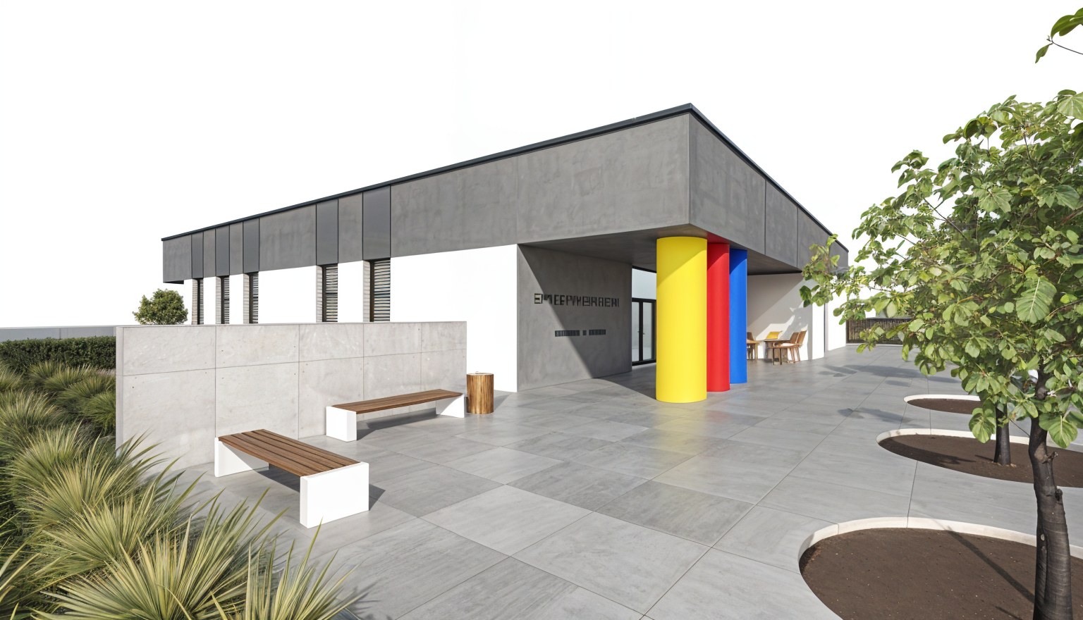 appartmant house plaster facade grass at the roof entrance floor with concrete full handrail at the balconies architecture