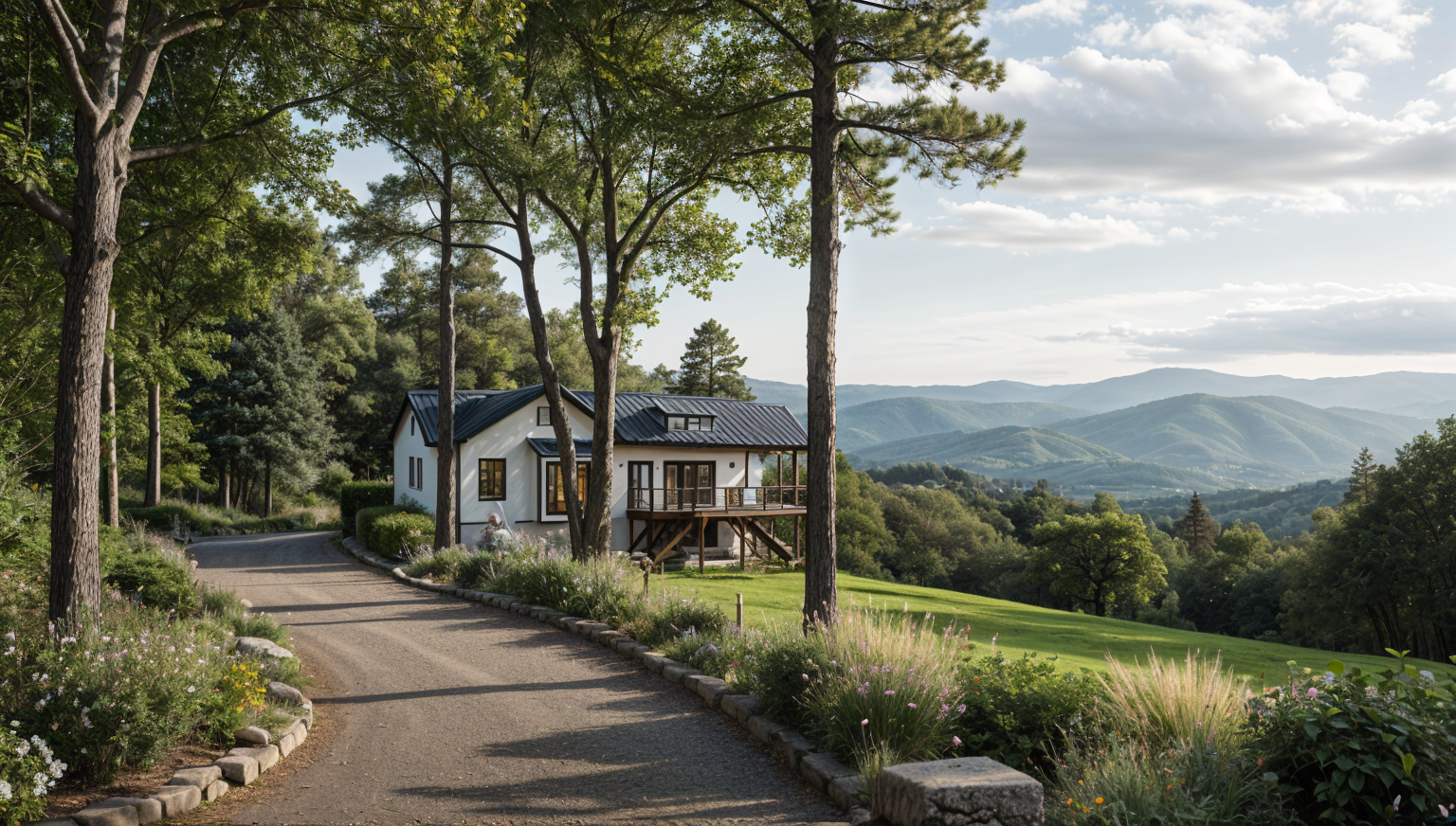 home sits in appalachian mountains with mature trees on the left side driveway enters on the lower level left side stone foundation and cable railings small mountain view on right with mature evergreen trees mature landscaping on left front architecture