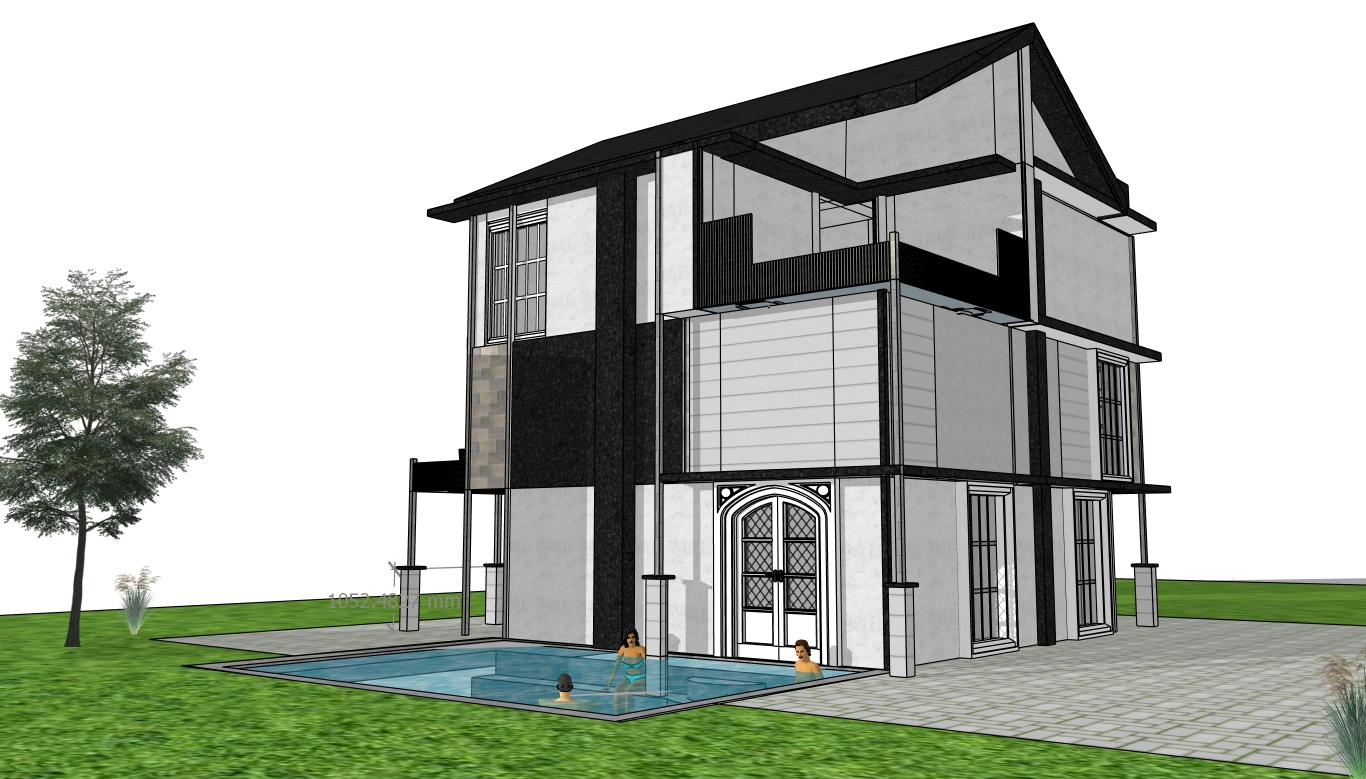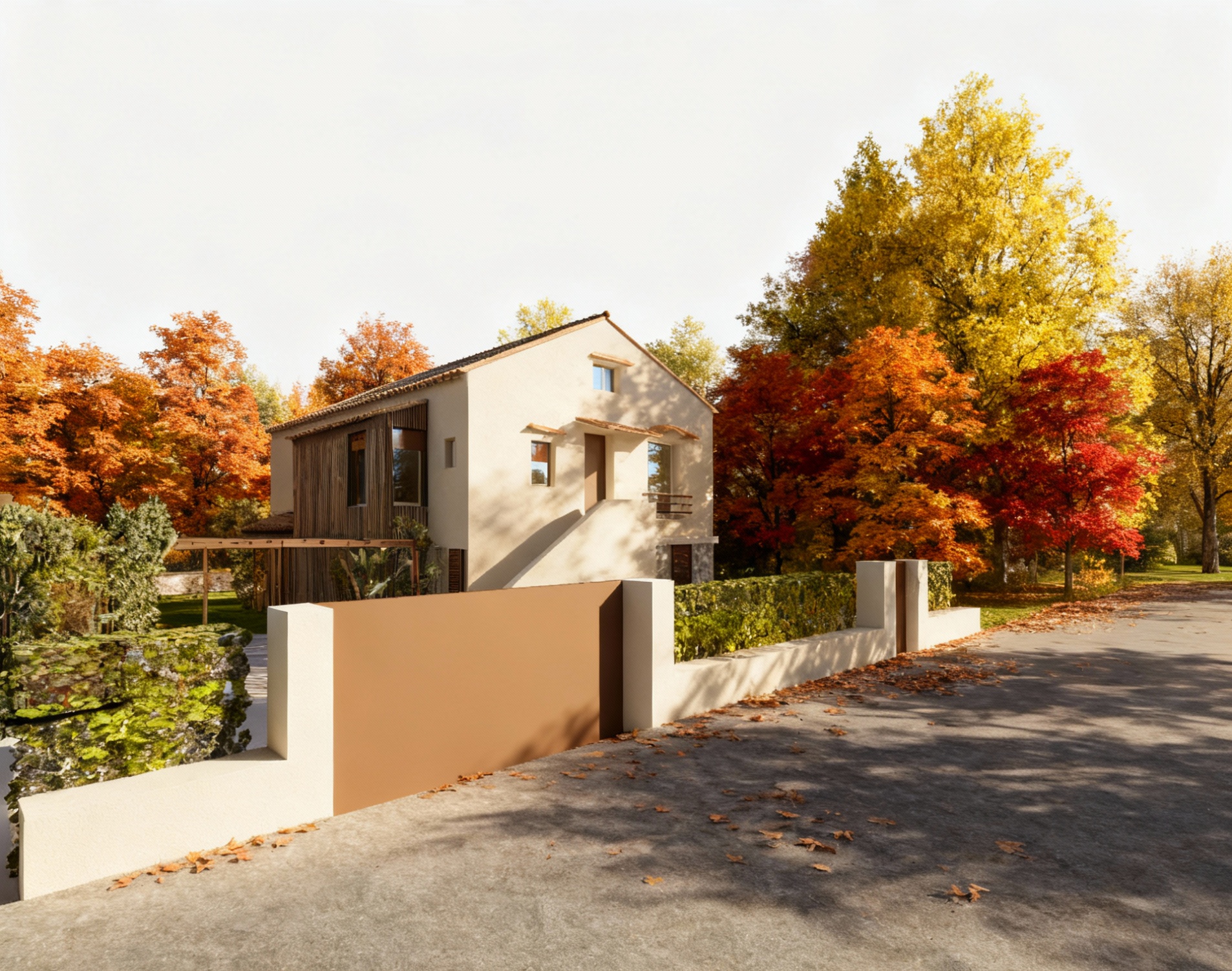 exterior shot following the same concept and materials render a charming and realistic tudor style house with elegant black and grey timber framing the exterior walls feature a mixture of textured stone and smooth white plaster accentuate the windows and doors with warm rich mahogany surround the house with lush green grass and tall full oak trees the atmosphere is serene and inviting with a gentle golden glow of a late afternoon sun casting soft shadows and highlighting the architectural details beautifully