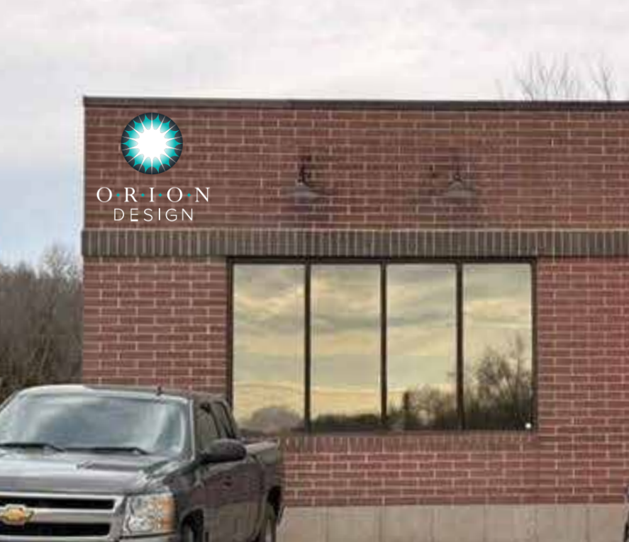 in the upper left hand corner of the building we want to modify the sign make the round logo larger ending and then drop the orion design words below the dark row of brick and make slightly larger