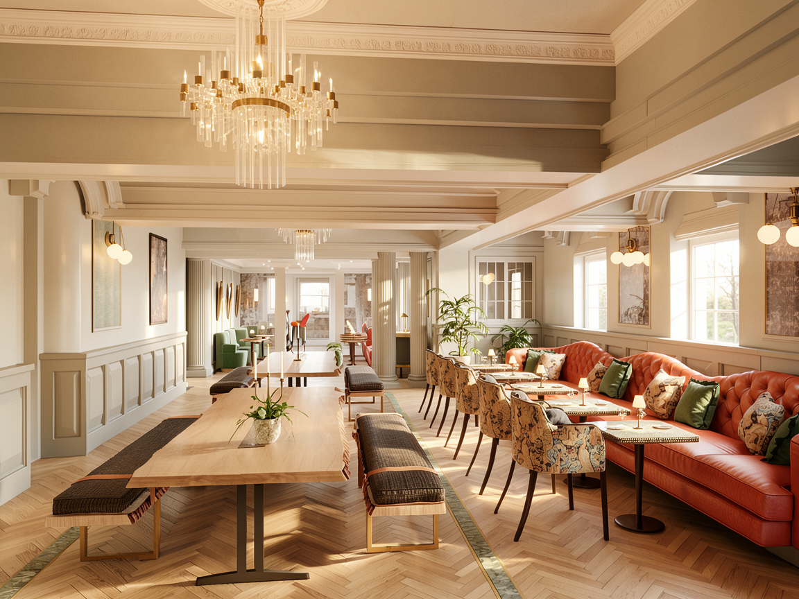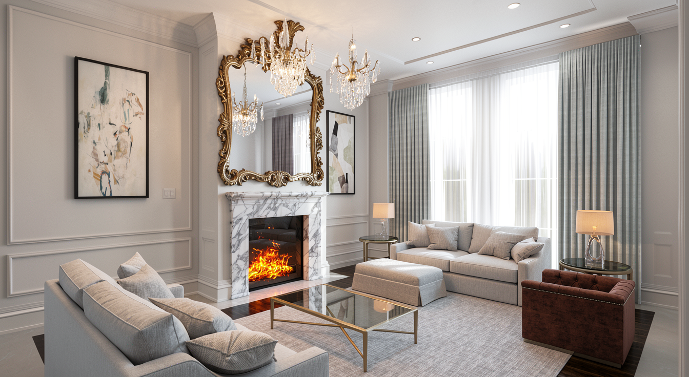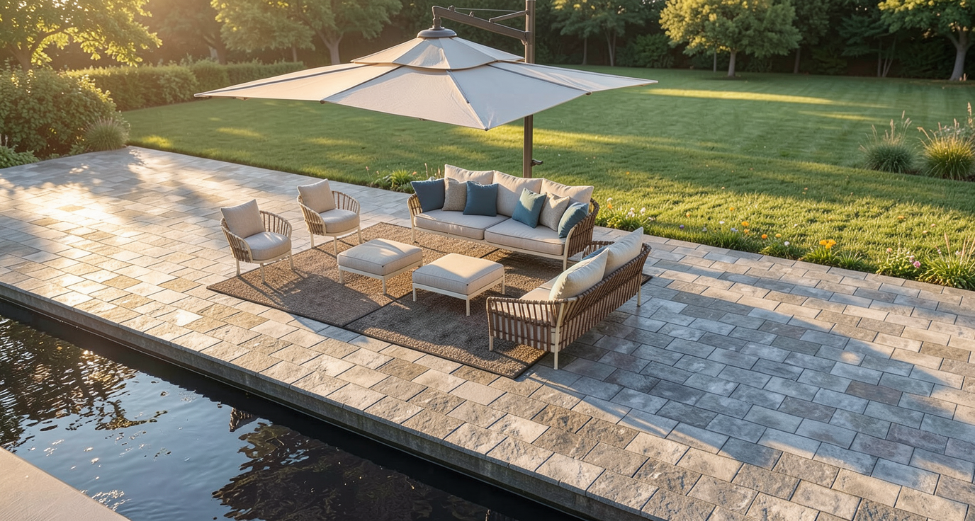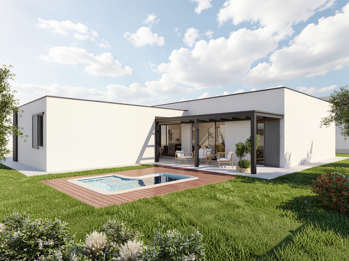 make as photorealistic as possible while keeping textures the same as selection professional landscaping in a lightly wooded scene with good lighting beige stucco dark brown brick dark roof