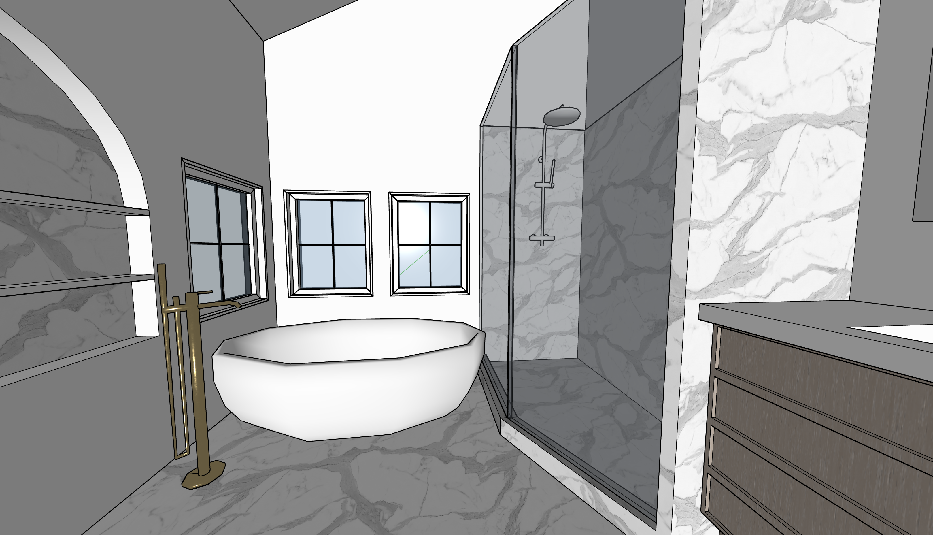 a luxurious modern bathroom with a serene and elegant atmosphere the walls are painted in soft white tones complemented by white trims and edges the shower enclosure is a frameless glass the shower interior is a sophisticated marble with a mix of light and dark gray veins the floor is a sophisticated marble with a mix of light and dark gray veins that reflects light with subtle sheen the vanity is crafted from light wood with brass drawer handles topped with a pristine white countertop the large frameless mirror above reflects ambient light enhancing the room s spacious feel the bathtub is a minimalist white adding a touch of luxury the window allows natural light to flow in creating a bright and airy atmosphere white marble with veining on the back wall of the shelving