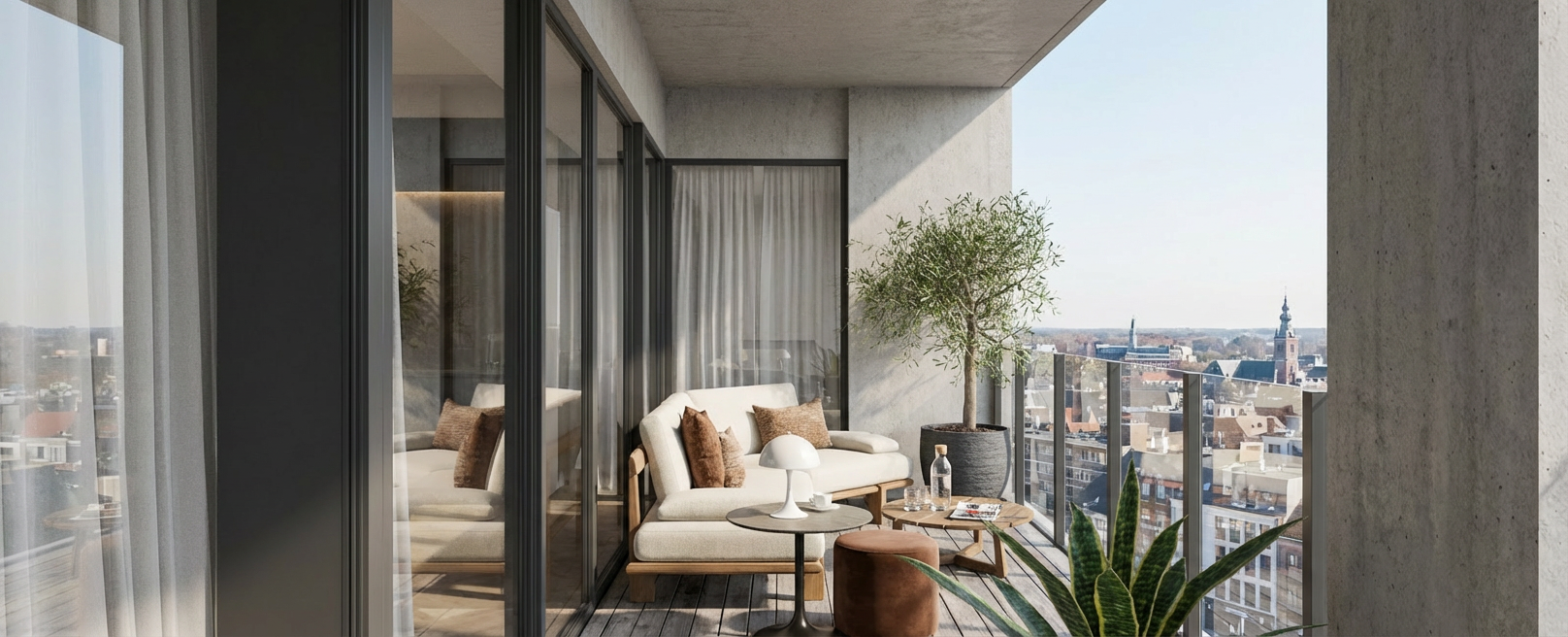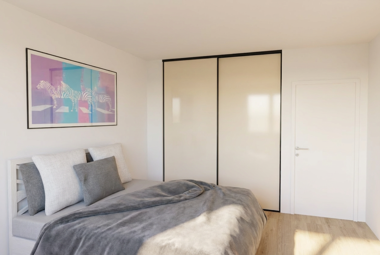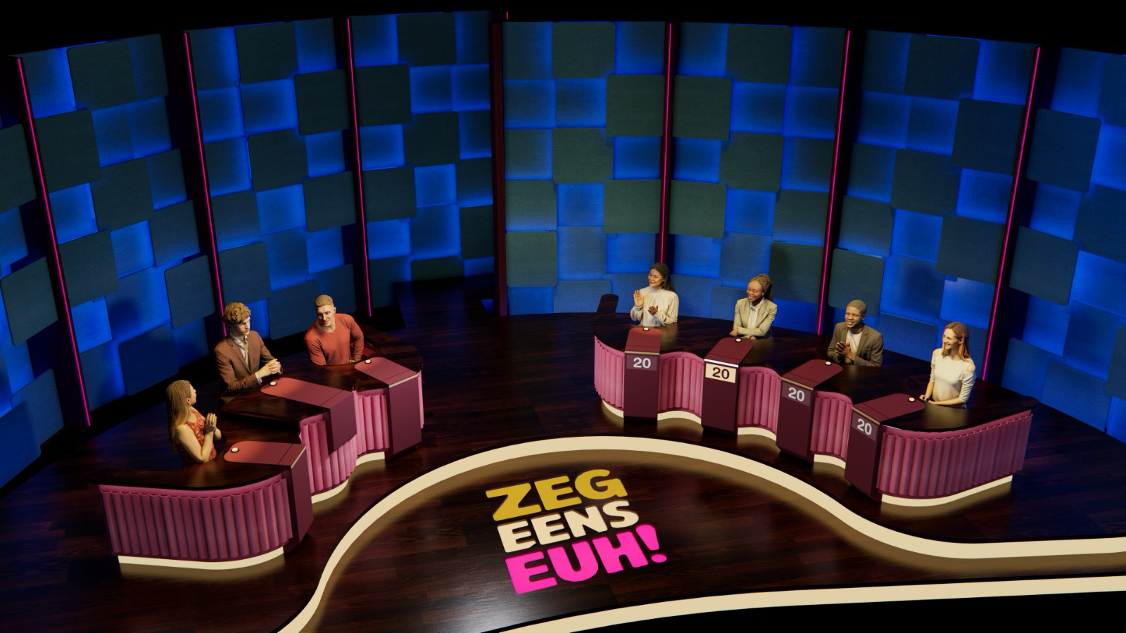 the black squares in the background are blue each individual square in the background consists primarily of blue with purple pink and orange tones the shadows are black the entire image is more saturated the vertical led line in the background emit an orange light the light under the desk have a warm glow vibrant colors highly saturated high contrast the color of the desk will be retained increase color saturation enhance contrast make the colors more vibrant while maintaining the architectural forms the light on the persons face remains the same as in the original photo do not change or add new structural elements there is no floor no dark shadow in the back no black in the background