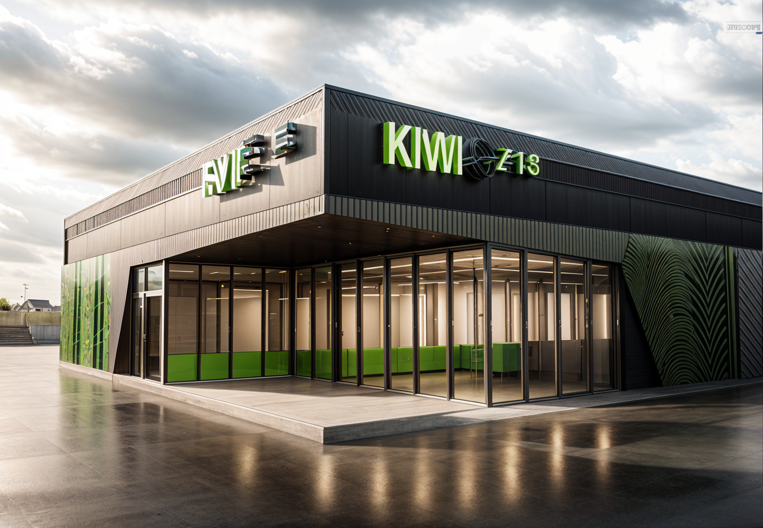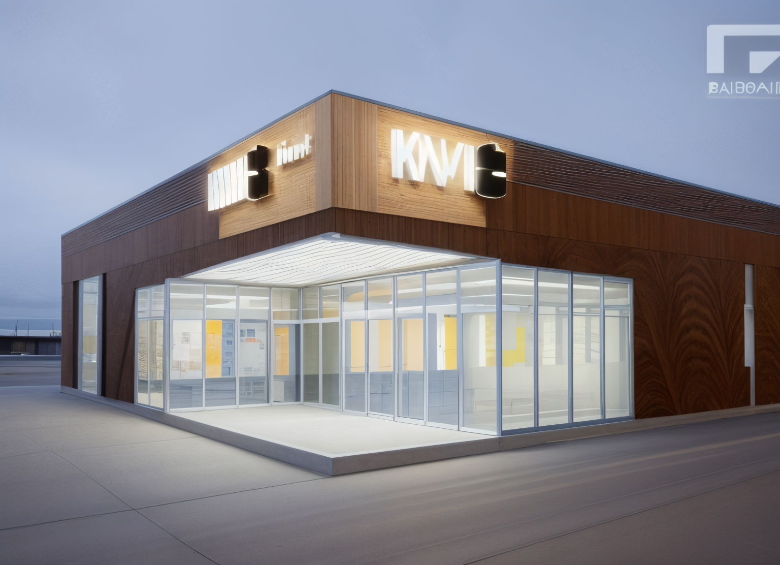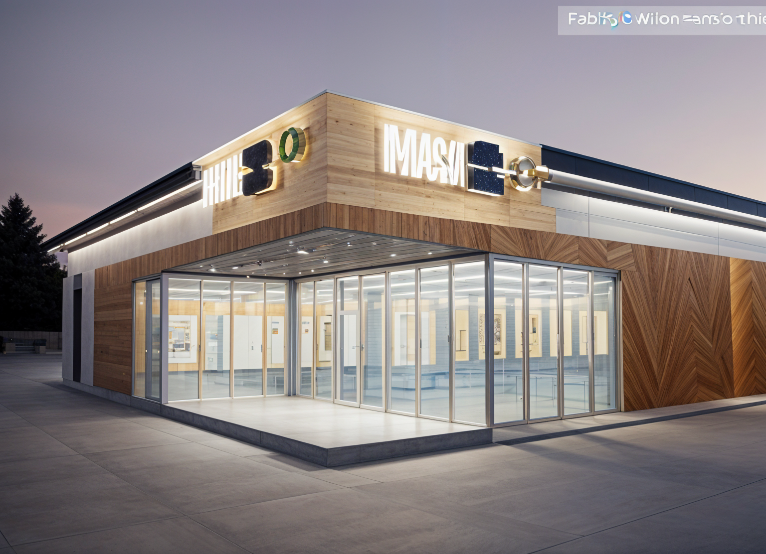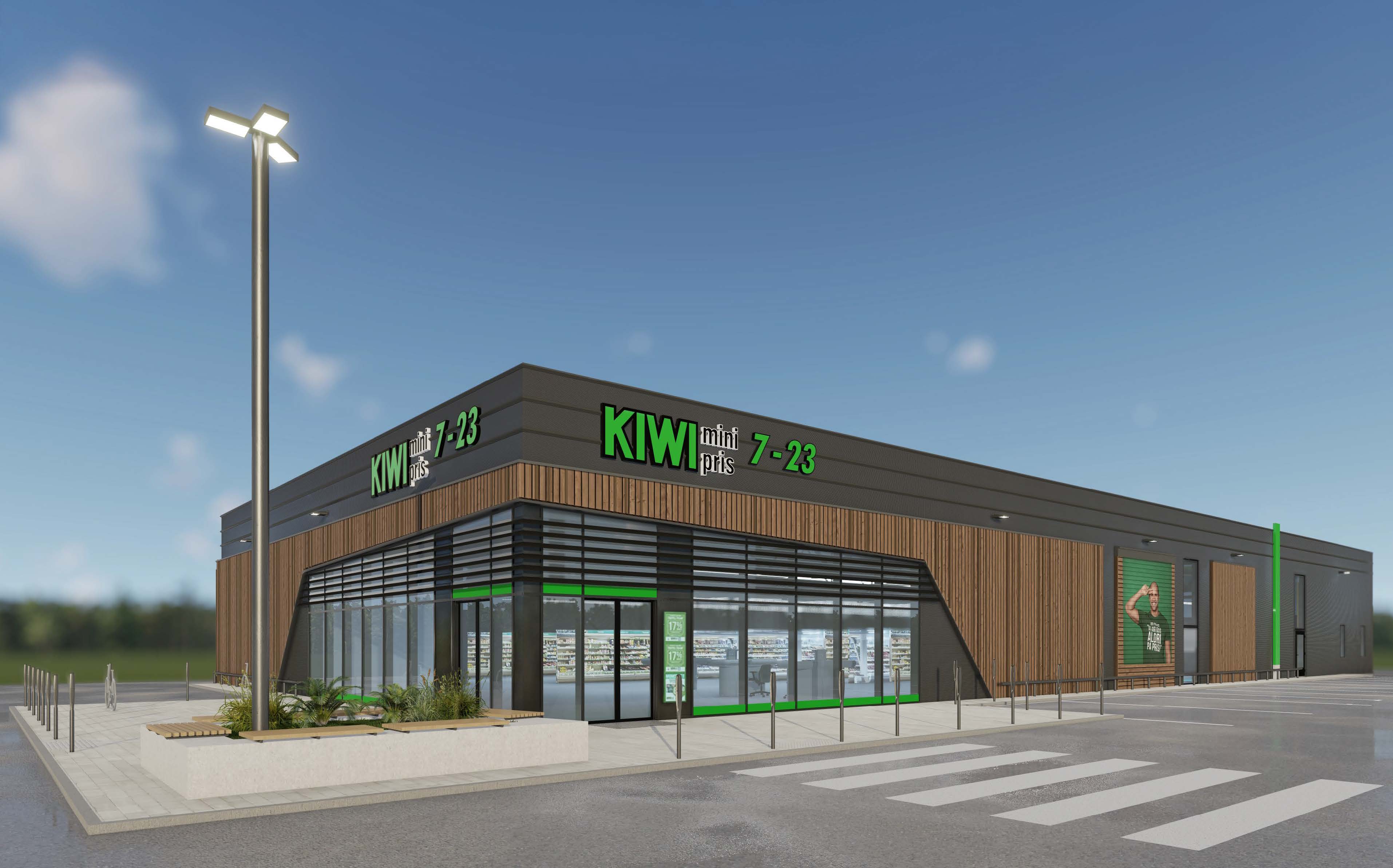exterior shot visualization in the evening with people entering the store in front of it inside grocery stands are visible through the glass facade make wooden parts of facade ligten up