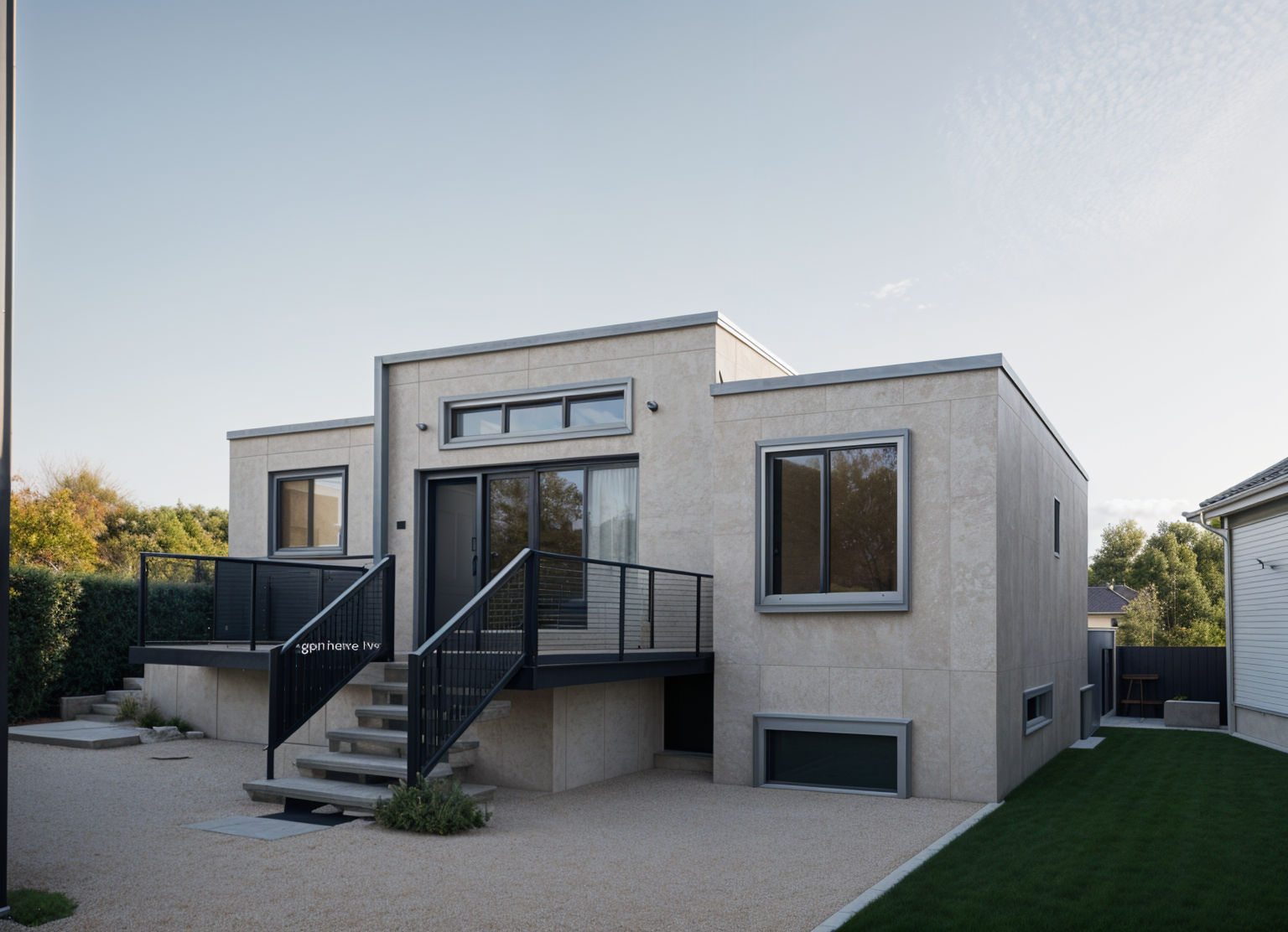 render a modern two story house use white for the vertical siding and dark gray for the horizontal siding use black asphalt shingles for the roof add large windows with dark frames for a contemporary look incorporate warm natural wood headers above the windows on the front set the scene in a meadow with trees in the background and landscaping around the edge of the house