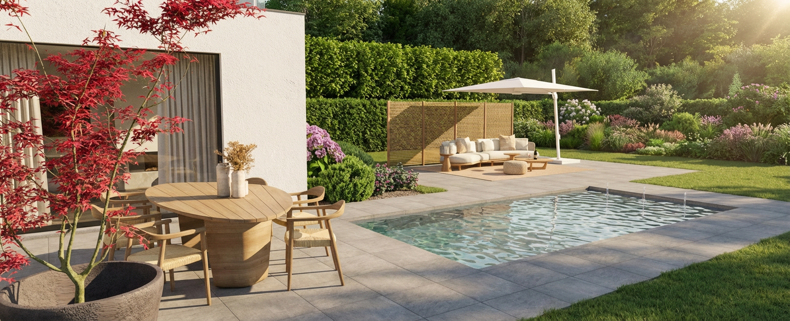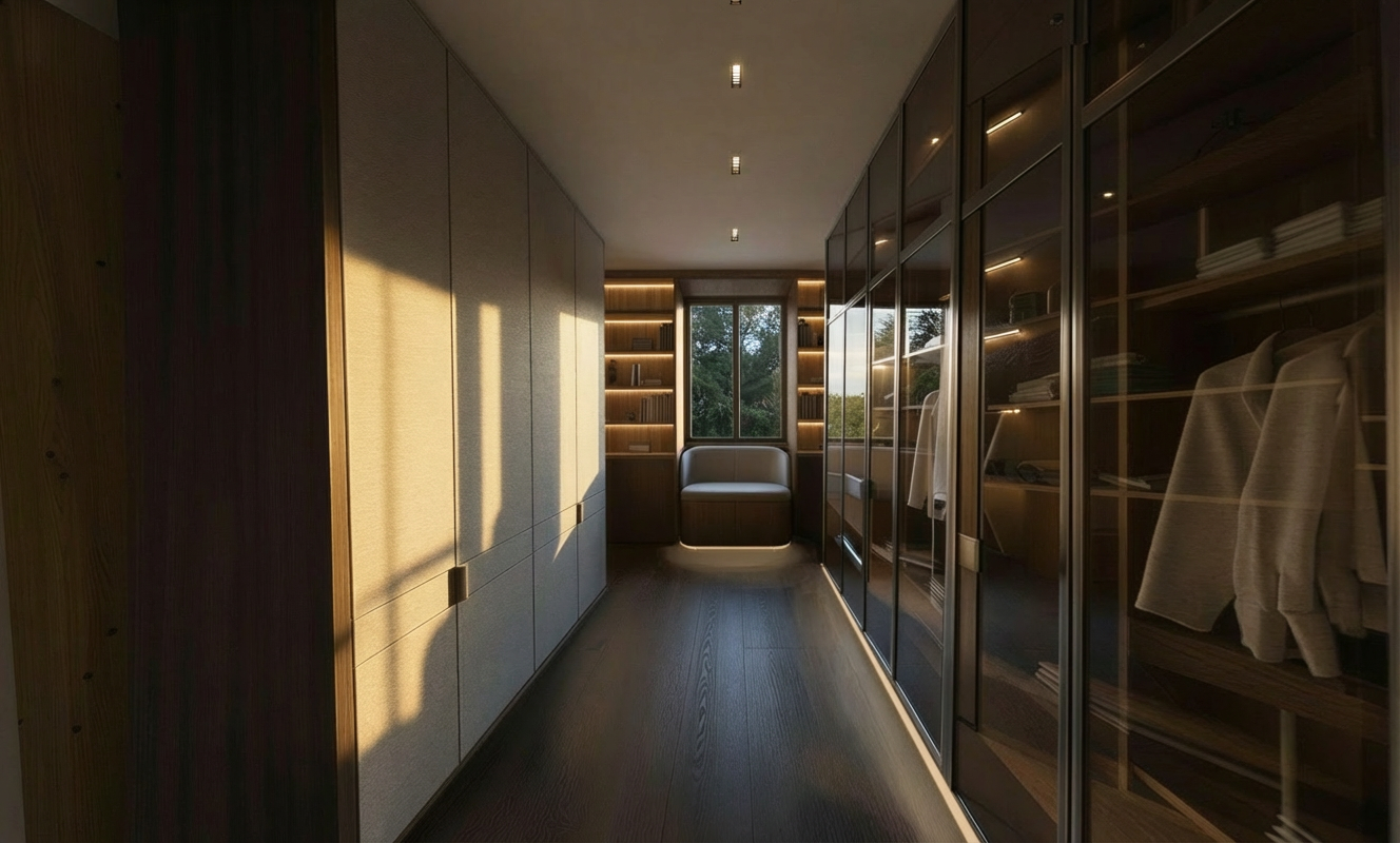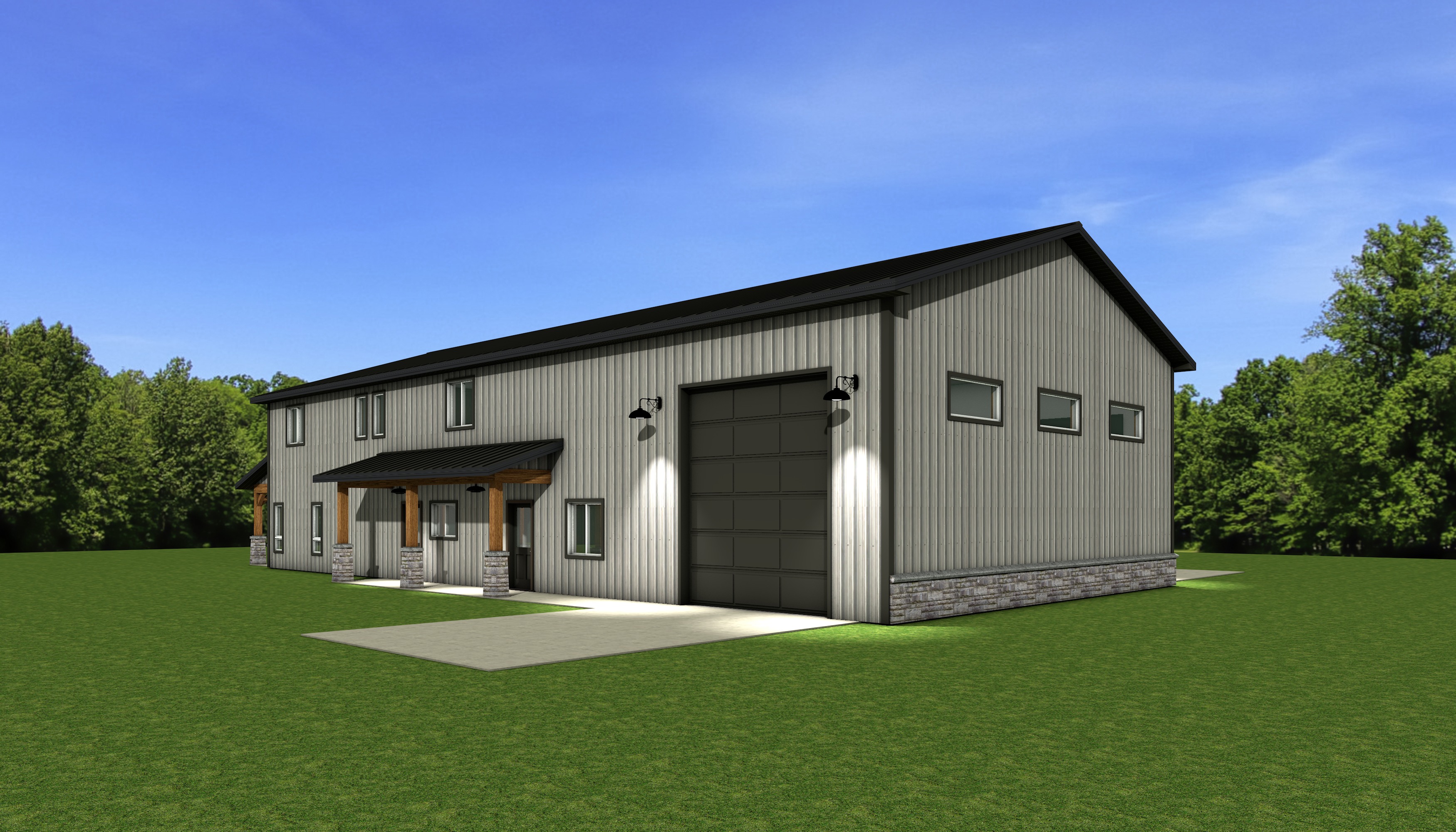 a very photo realistic image of a modern house retain the exact structure colors and window arrangement rooflines shiny new metal siding foundation height railings wood stain colors and proportions exactly as shown in the reference image integrate into the terrain there are very few trees of mixed hardwoods that are mostly on in the distance of the image add warm diffused afternoon sunlight subtle dappled highlights across the siding and grass create ultra realistic lighting crisp shadows detailed textures in the siding and glass reflections and an overcast sky show only a few lights visible inside render in hyper photo realistic architectural visualization quality 8k resolution make it the fall season add realistic landscape around the structure add a large pasture further behind the structure with white 3 rail farm fence the grass around the structure is mowed add some small landscape bushes and plants around the porch