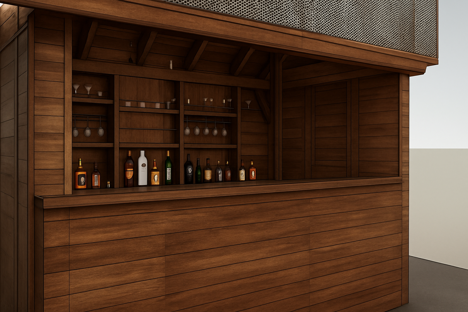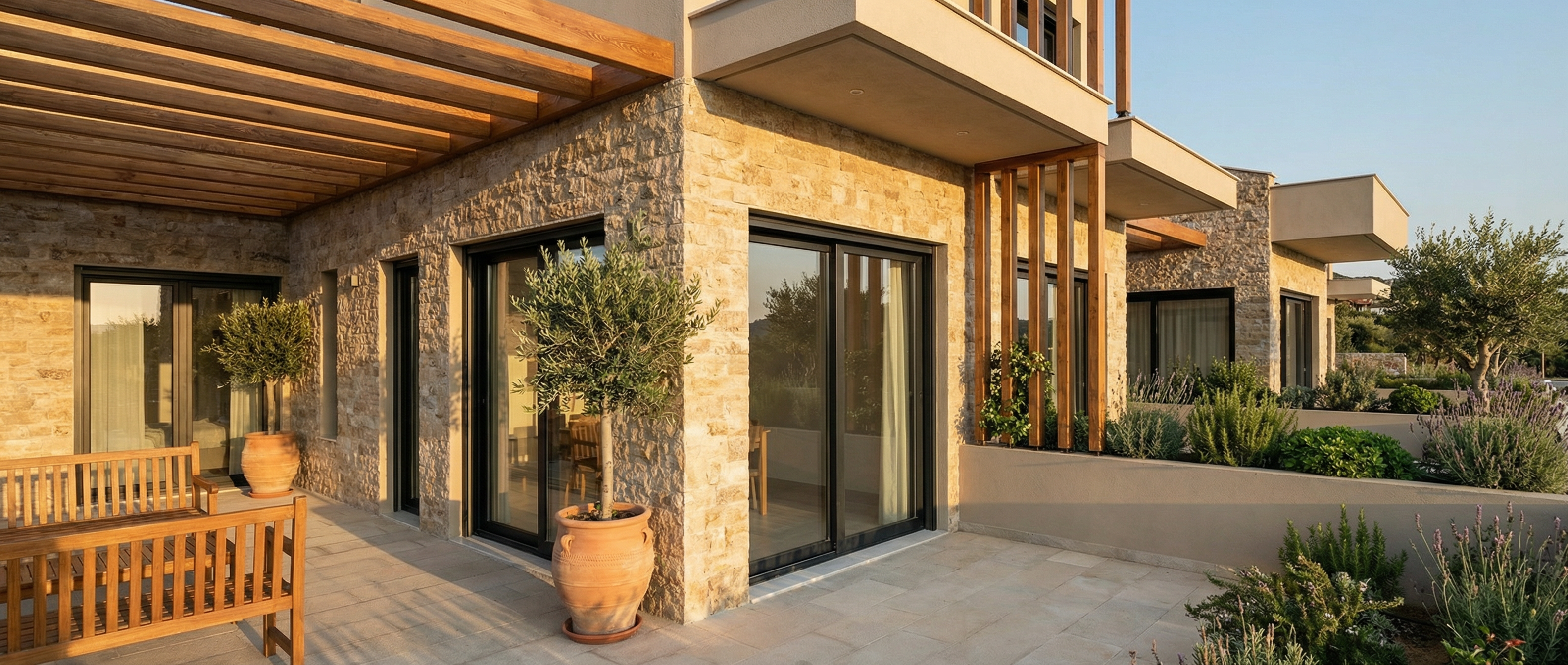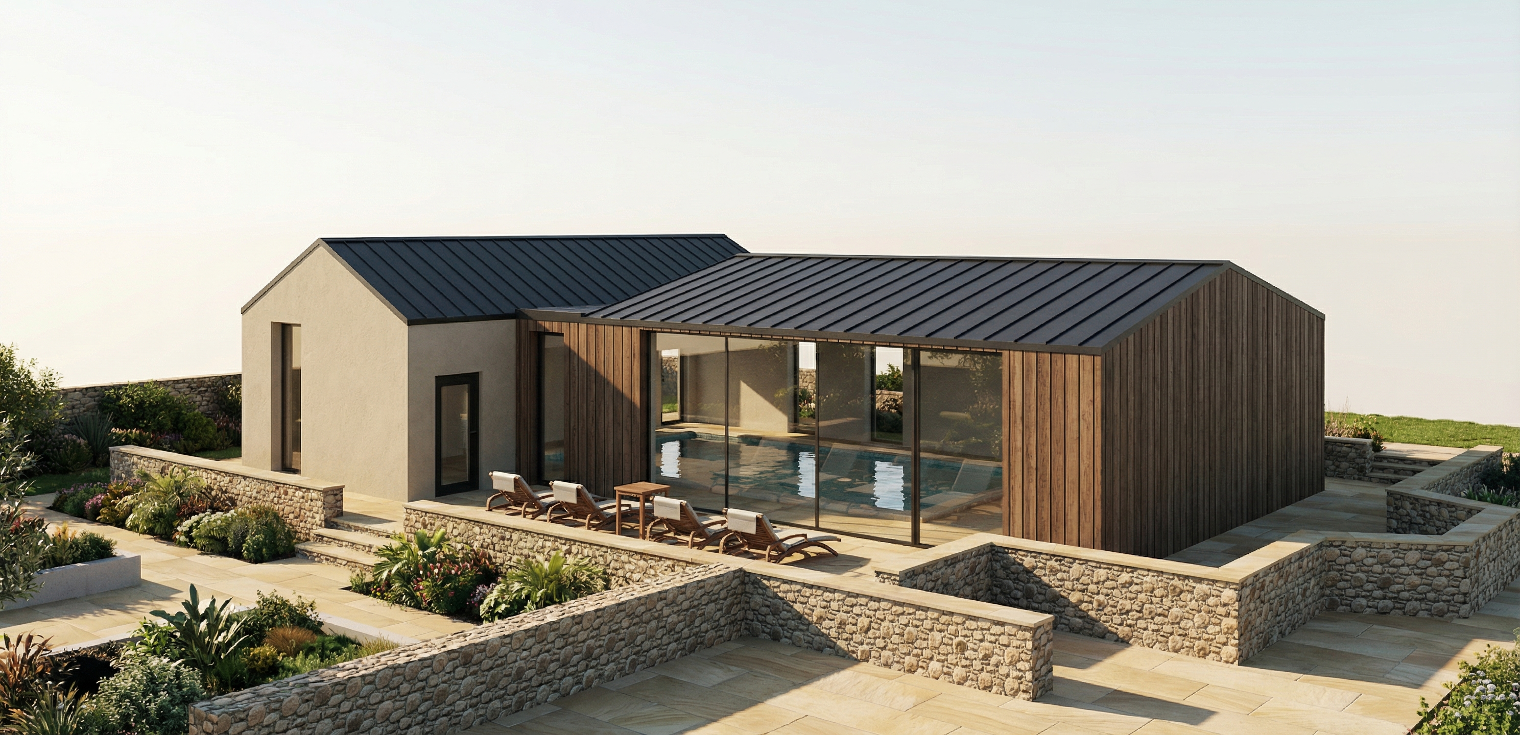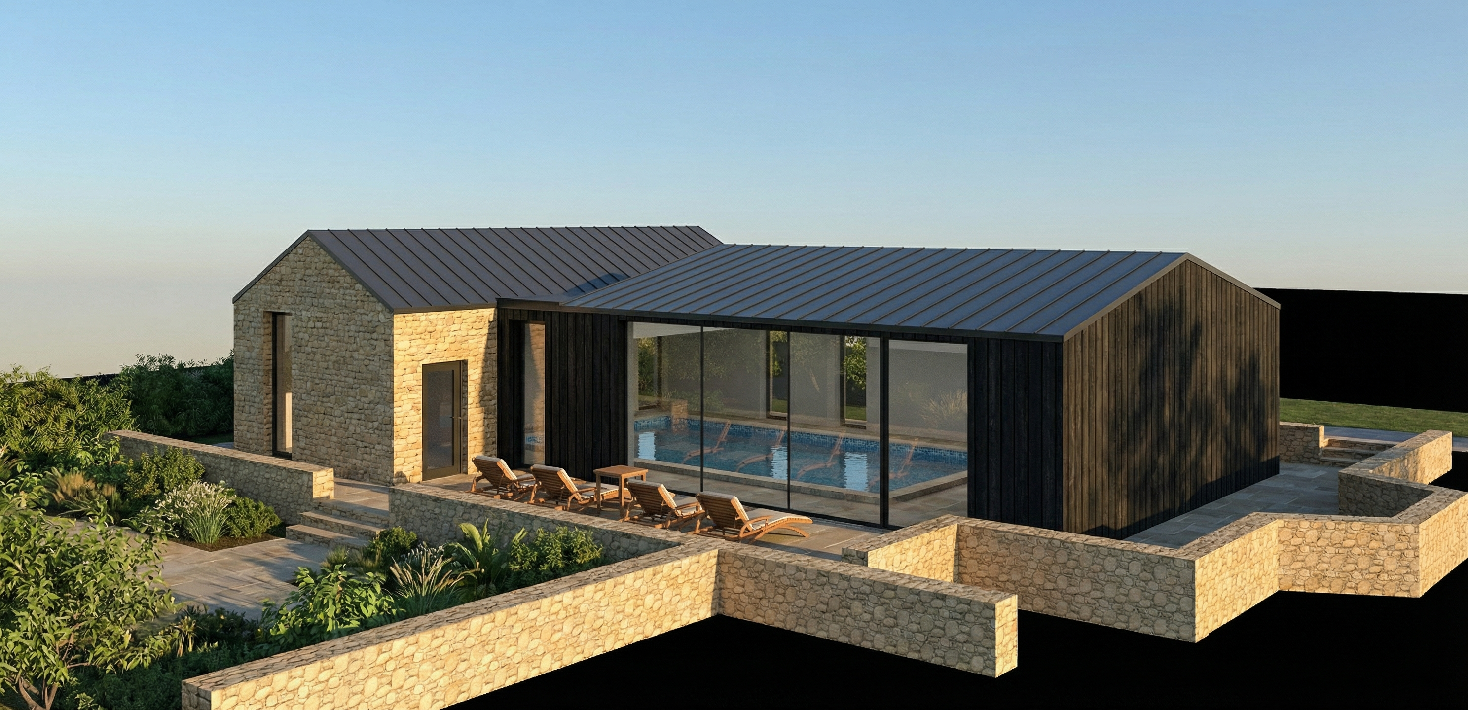 a pool house made from stone and black vertical timber cladding set within a paved garden