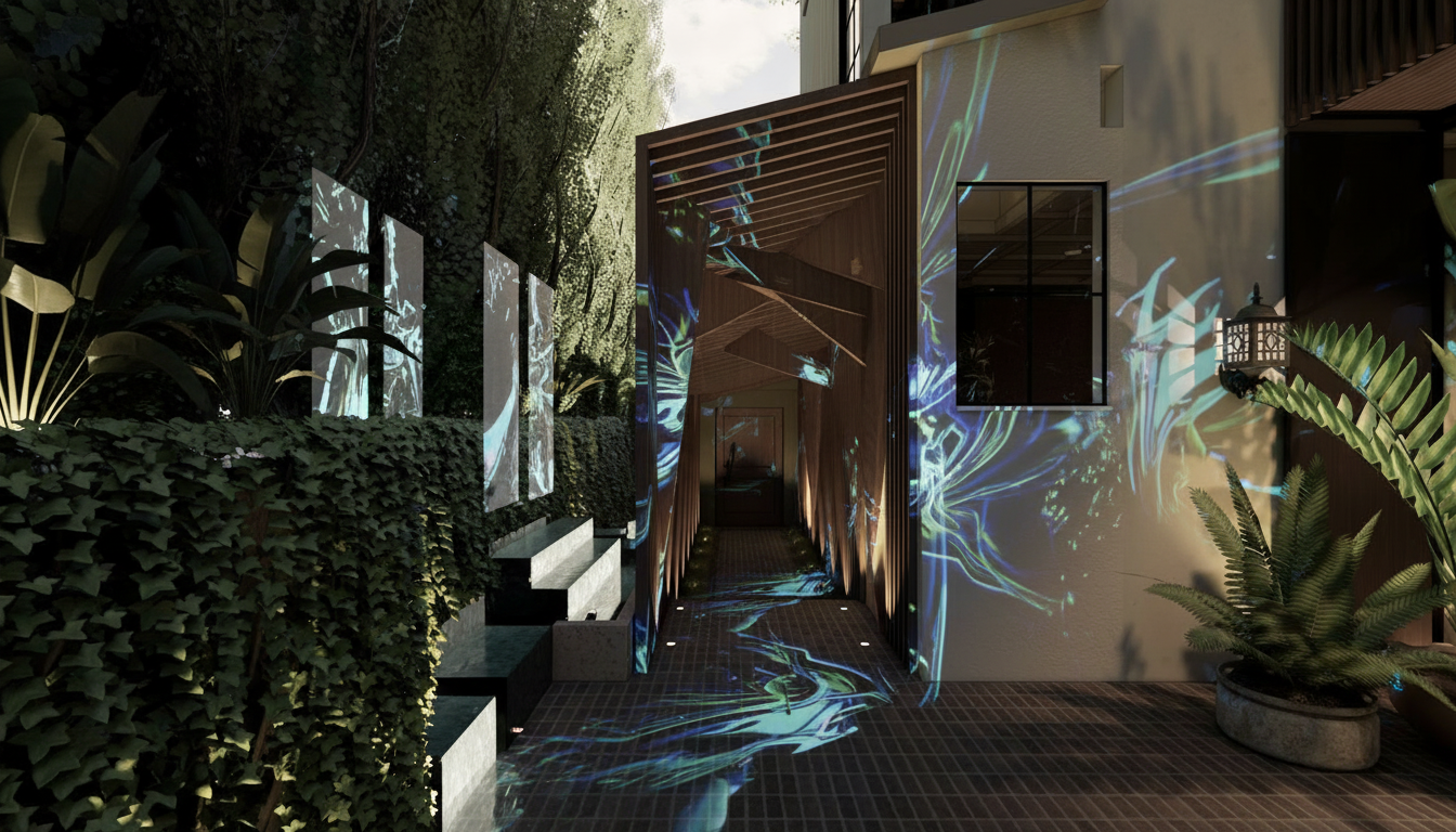 the outside environment is a large deck with the bay and woods behind it the floor is a natural hardwood the walls are a beige tan color doors and trim are white ceiling is 20 tall the bar stools in the front are black leather the chairs on the right a light camel color velvet and don t have piping the chair on the left is the natural upholstered dining chair by paul mccobb lamp shades are beige linen the rug is a subtle brown transitional pattern the orange pendants are glass shades add a pair or vintage water skis in the corner by the floor lamp as decor