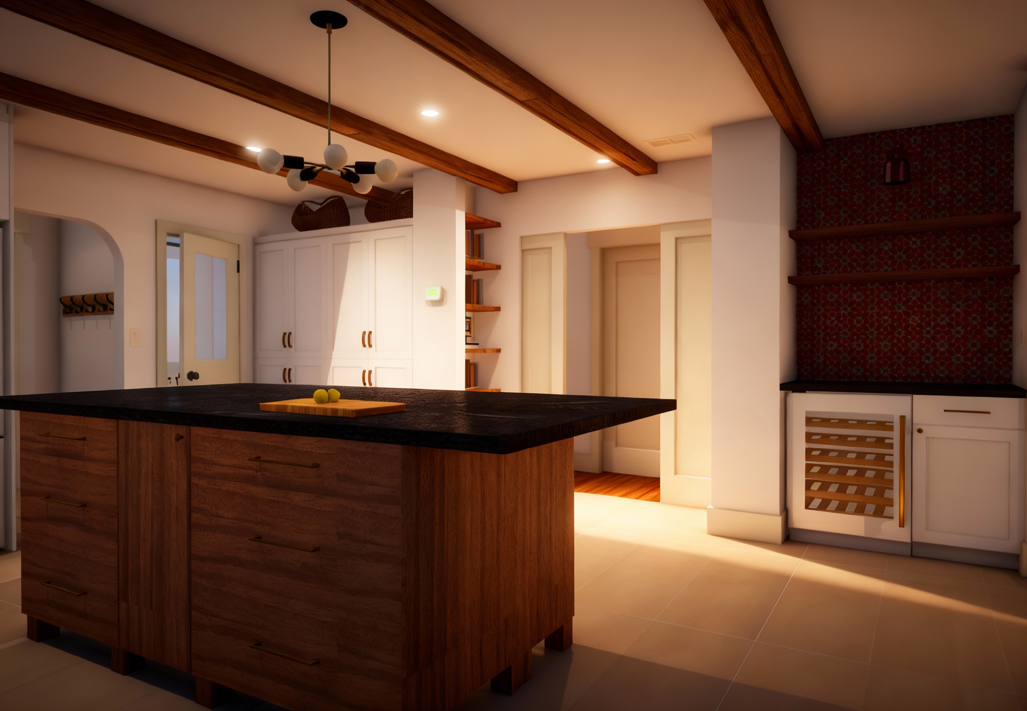 create a photorealistic rendering of this kitchen with soft warm lighting that is not harsh