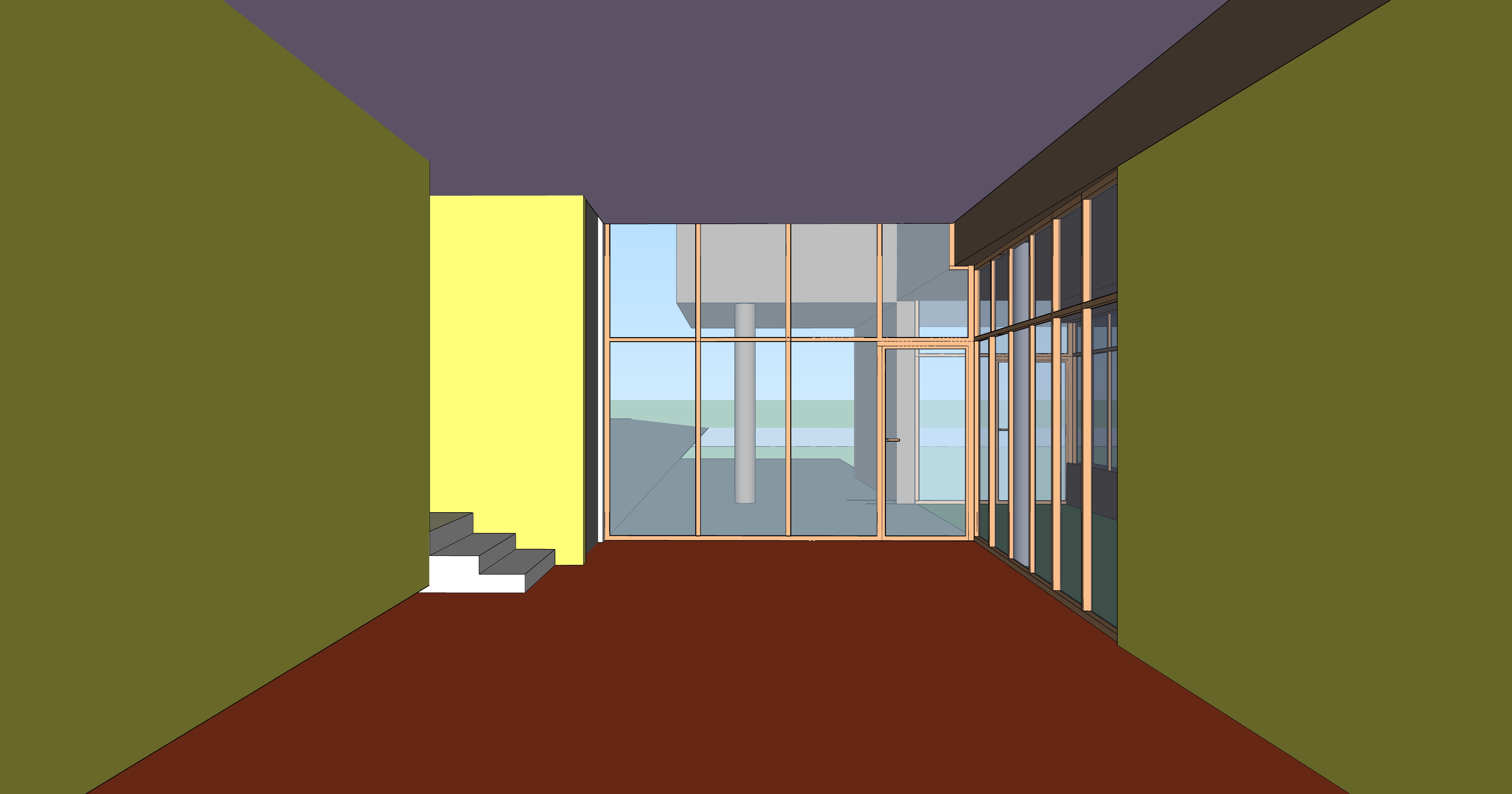 from this vantage point you can see a school cafeteria with a round table in the foreground and rectangular tables and chairs this is the teachers dining area to the left of the wall is the teachers self service area on the right wall are two art posters the floor is a seamless speckled floor in white terracotta and brown the ceiling is a white perforated gyptone type ceiling with linear recessed lighting