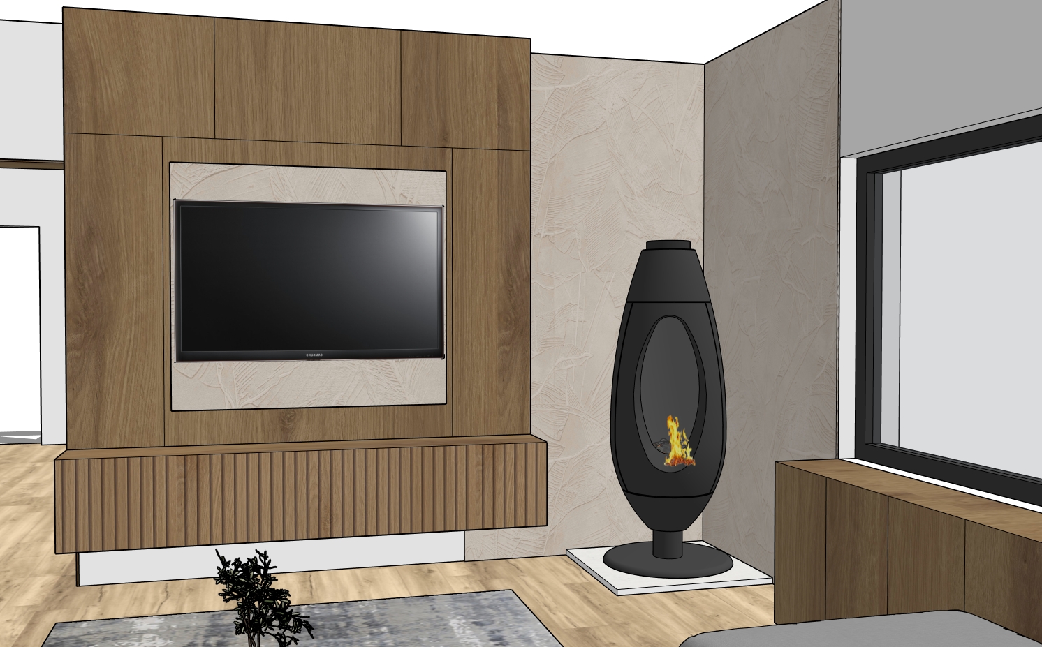 the same living room respect the geometry give it a nordic atmosphere the metalic firepit is antracit grey