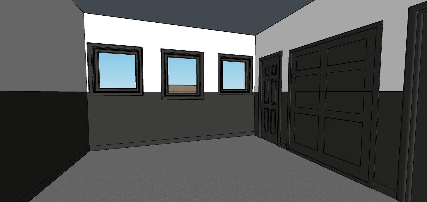 maintain all model geometry this should feel like a high end home office the ceiling should be a dark moody wallpaper with a contemporary style ceiling light the doors should be painted in a semi gloss finish decorate the room as a modern office space with a desk computer accessories and modern chair the carpet should be plush and look expensive the wainscotting should appear as painted framed casework add a couple of contemporary sconces and modern wall art