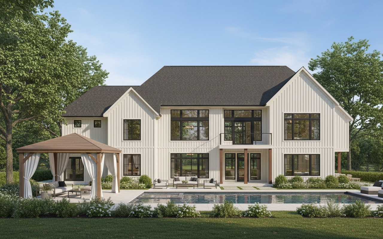 mostly black siding with some cream add landscaping vertical batten cedar posts under deck make it modern with no farmhouse vibes add a pool with built in spa on same level as pool add a cedar gazebo with curtains add outdoor furniture no stone or brick on the house zoom way out add trees