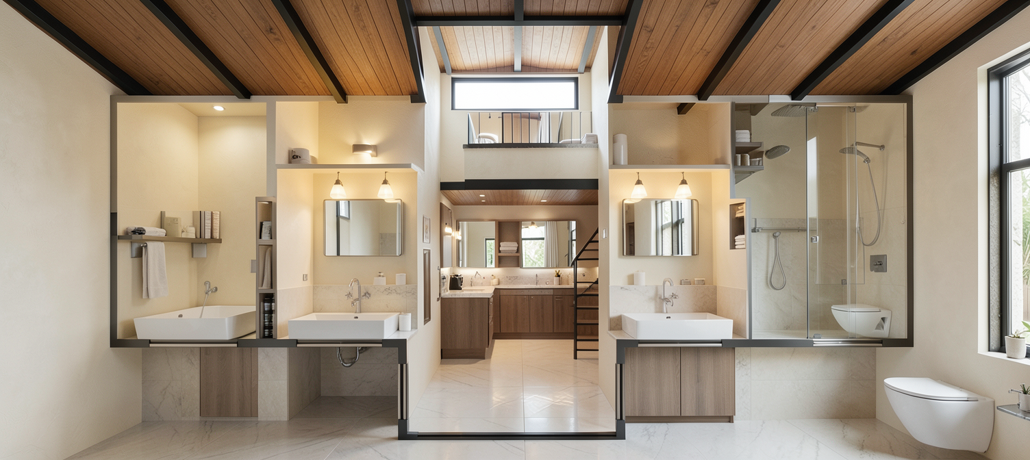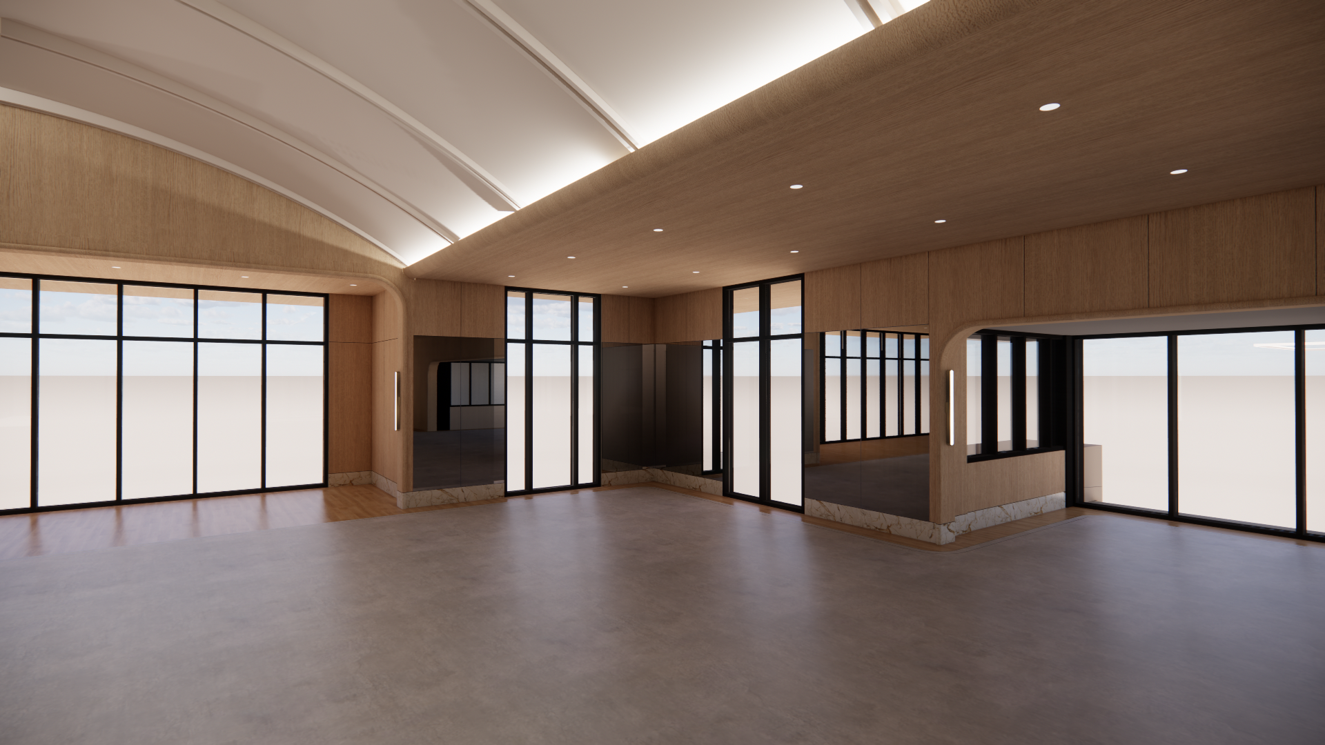 minimalist interior space with a modern elegant design large floor to ceiling windows allow natural light to flood the room wooden walls and ceiling in natural oak tones add warmth the smooth light gray floor conveys a sense of spaciousness ceiling lights are gently glowing creating a serene and inviting atmosphere the arched ceiling is in a soft white complementing the neutral color palette the atmosphere is bright airy and calm with a touch of sophistication the views overlook the golf course the ceiling is warm white