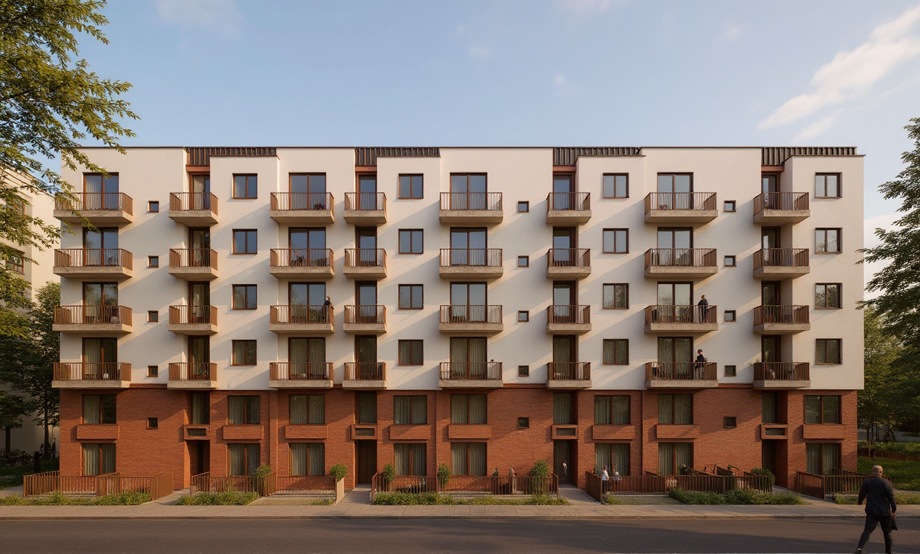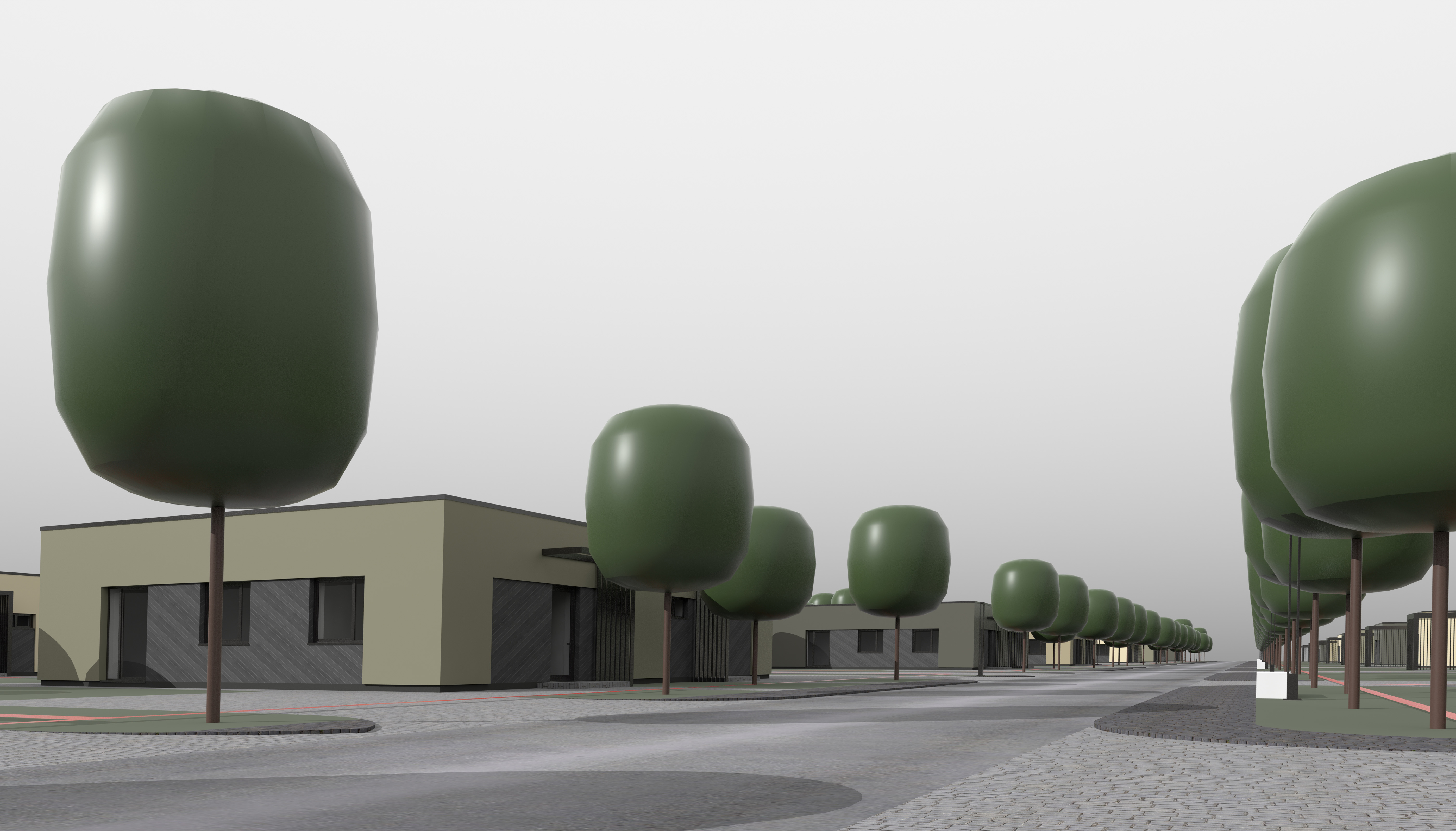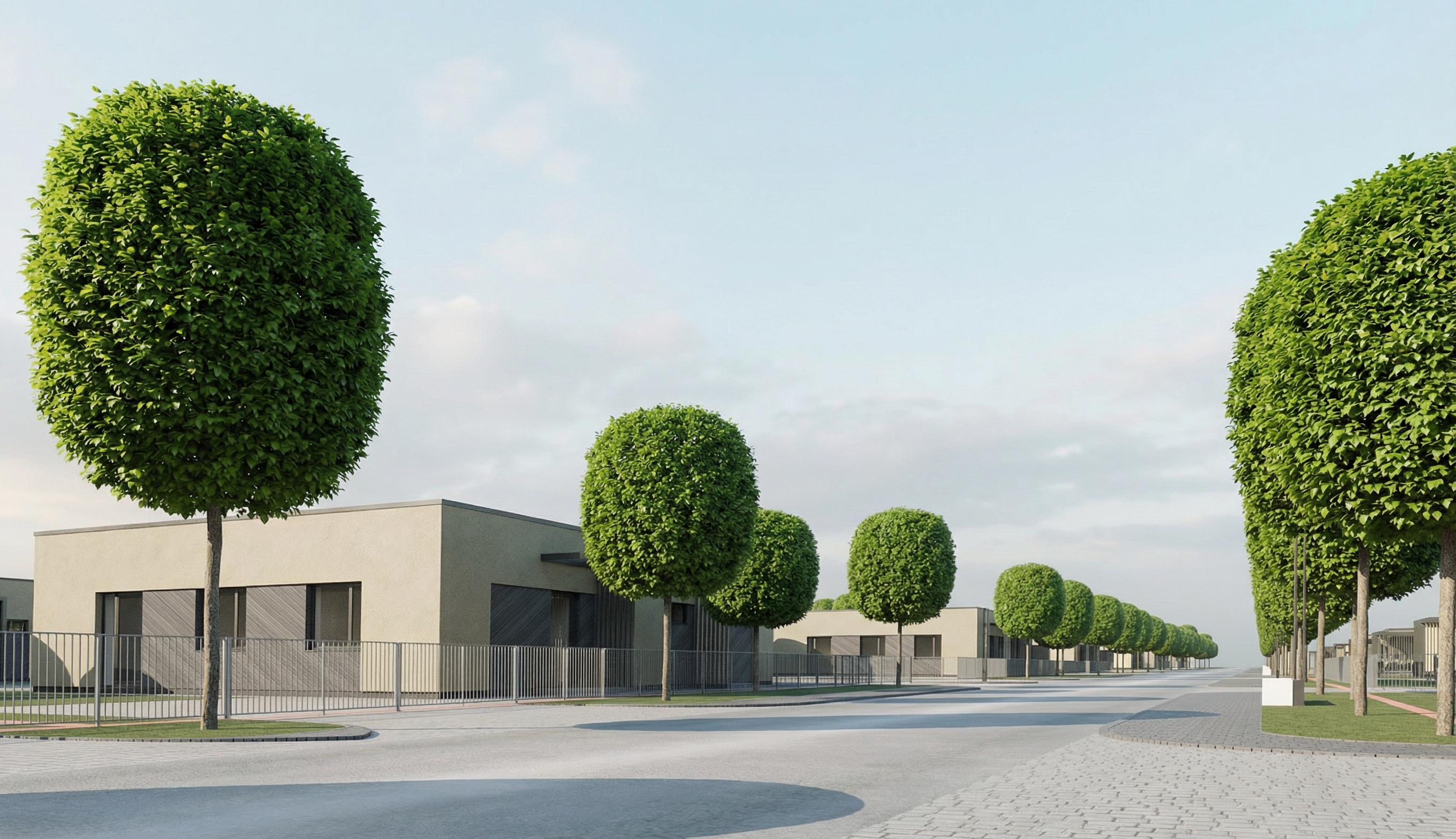 a modern suburban neighborhood with rows of minimalist houses each with a flat roof and rectangular shape the houses are painted in soft beige and dark gray creating a harmonious contrast beige colors are are plaster texture and dark grey wall patches made from 45 degrees wood panels surrounding the houses are lush scots pine trees in vibrant green evenly spaced along the streets the streets and walkways are smooth paved in light gray change red boundary lines to dark grey metal fence adding a geometric precision to the layout the atmosphere is peaceful and orderly bathed in soft diffused sunlight under a cloudy blue sky