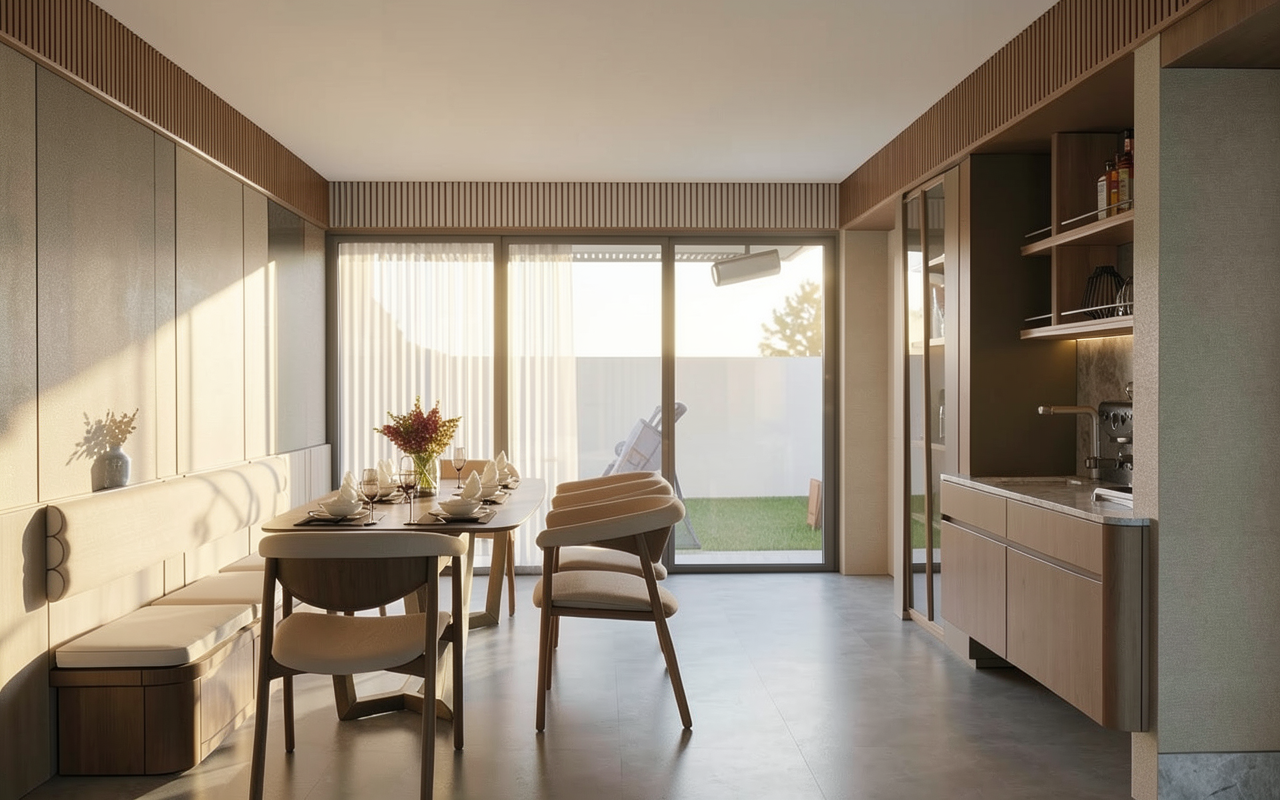 generate beautiful precises isometric render moderm bedroom evening render add lights rough bed cushion tecture day light soft shadow italian wood flooring glow hanging light hyper realistic
