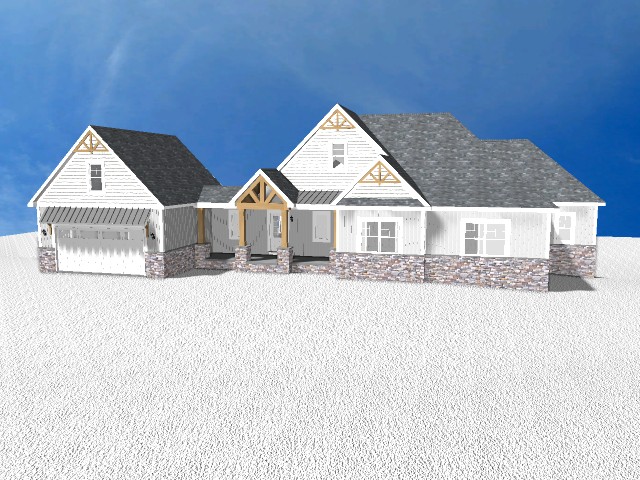 make this front elevation photorealistic while keeping textures and architectural elements the same as selection add professional landscaping on a lightly wooded scene with good lighting that is in heltonville indiana use the following colors and materials board and batten siding to be 62615c in color shake siding to be 62615c in color siding corner boards to be 62615c in color limestone veneer to be provia limestone buff shingle roofs are to be certainteed dimensional shingles in driftwood standing seam metal porch roof are to be matte black in color standing seam metal garage door roof are to be matte black in color windows to be white in color window trim to be white in color fascia soffit gutter and downspouts to be white in color frieze boards are to be white in color exterior wall lights are to be black in color entry door to be painted 323132 in color garage door to be painted white in color entry door trim to be white in color porch columns to be stained sherwin williams woodbridge sw 3504 queen accent trusses to be stained sherwin williams woodbridge sw 3504