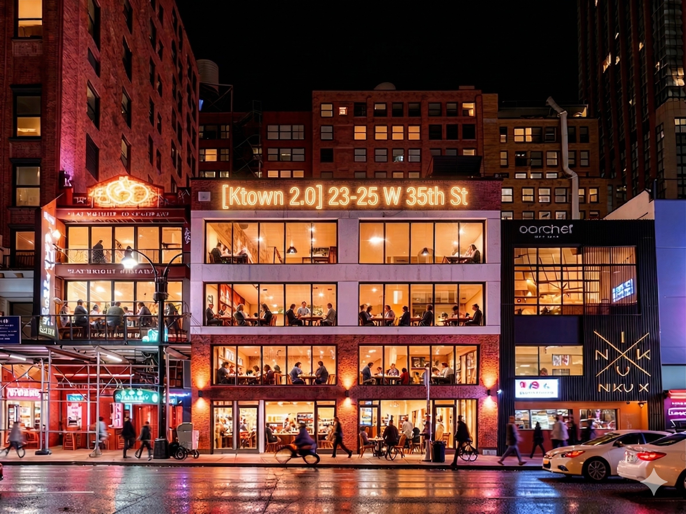 keep the entire image unchanged preserve the original composition lighting perspective people and overall nighttime nyc atmosphere remove the construction structure on the left side of the building at street level including scaffolding temporary framing barriers and any attached signage or lighting replace the removed area with a clean realistic continuation of the streetscape extend the sidewalk naturally with correct perspective and texture continue the storefront facade or adjacent building frontage in a cohesive way maintain consistent lighting shadows and reflections from surrounding elements ensure pedestrians and street activity remain natural and uninterrupted do not alter the main building neon signage or interior scenes photorealistic result seamless inpainting no visible artifacts or distortions