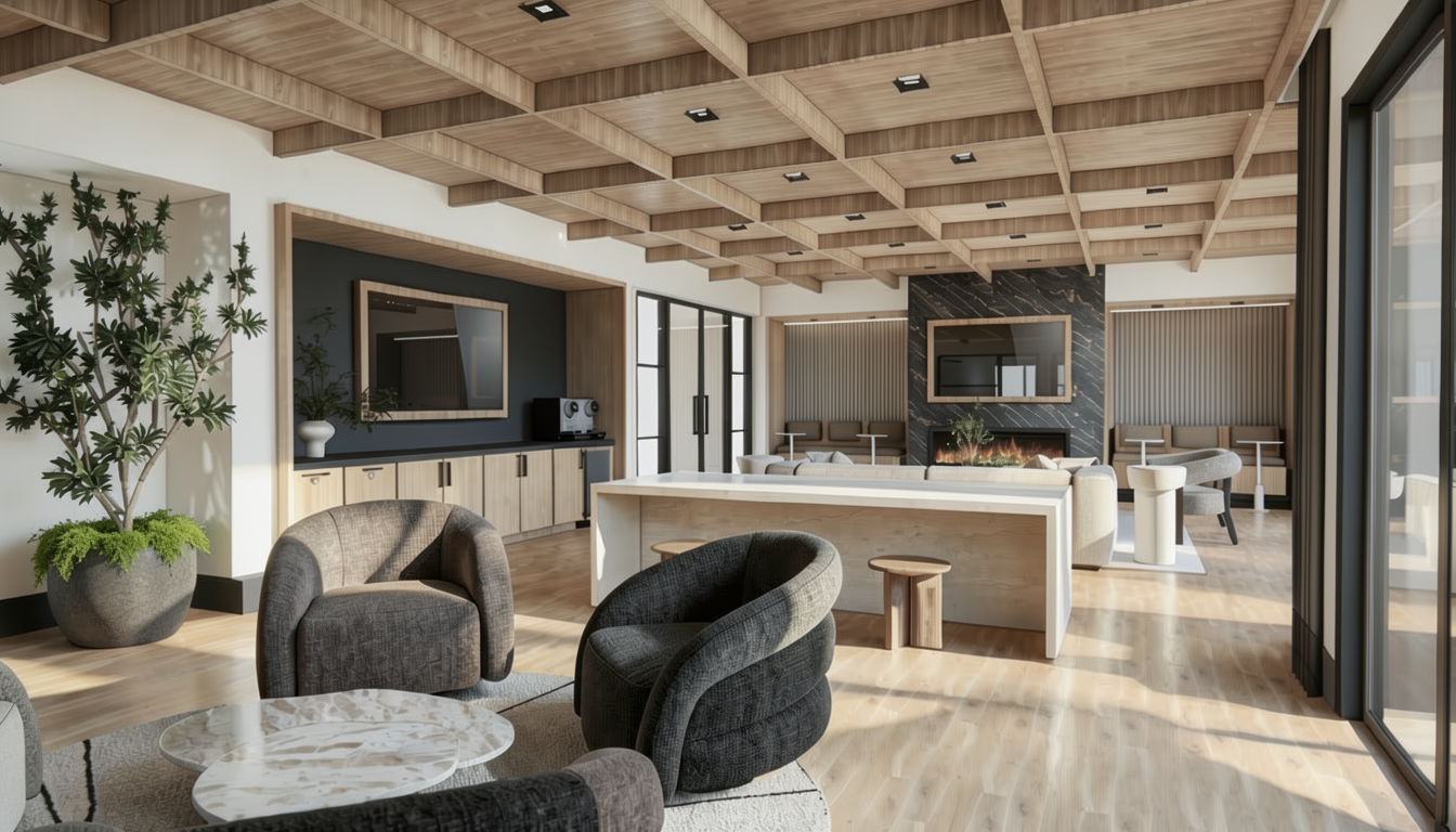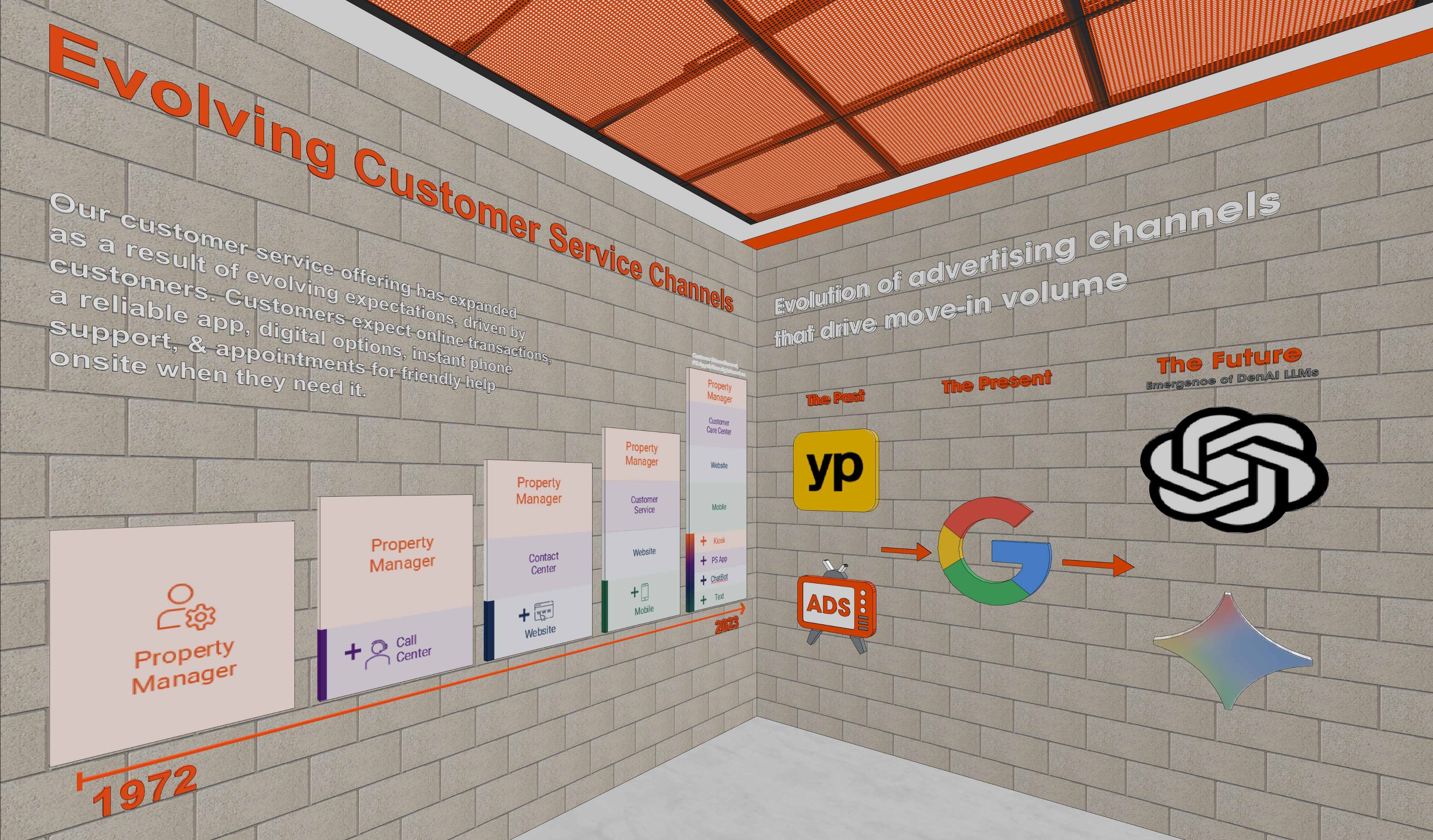 photorealistic high resolution interior polished concrete floors cmu block walls the space is lit up with soft ceiling soft lights ceiling perforated metal orange panels that glow light bright warm lighting and overall environment is soft bright lighting symbols on the left are back lit soft glow but keep colors as shown