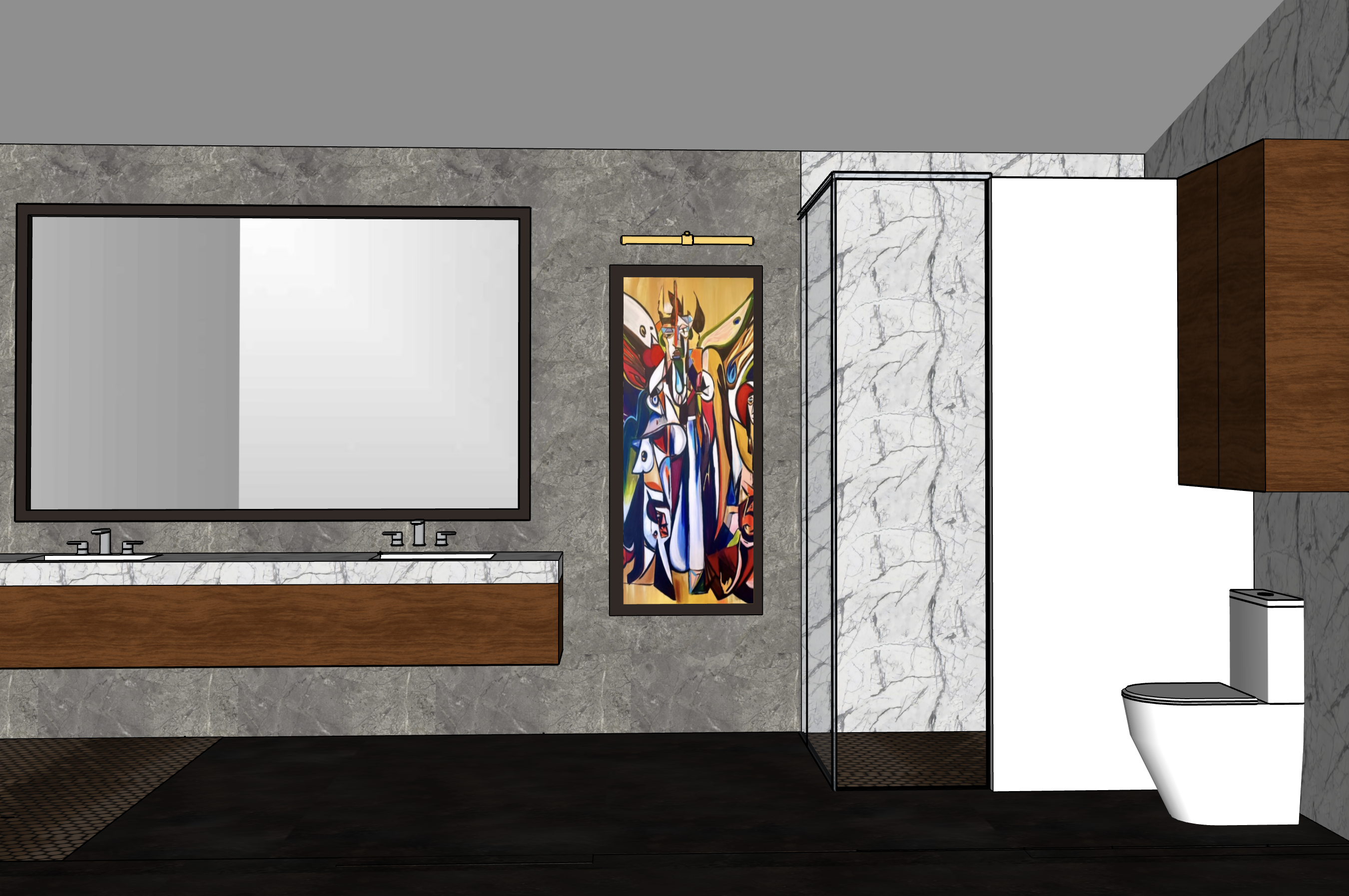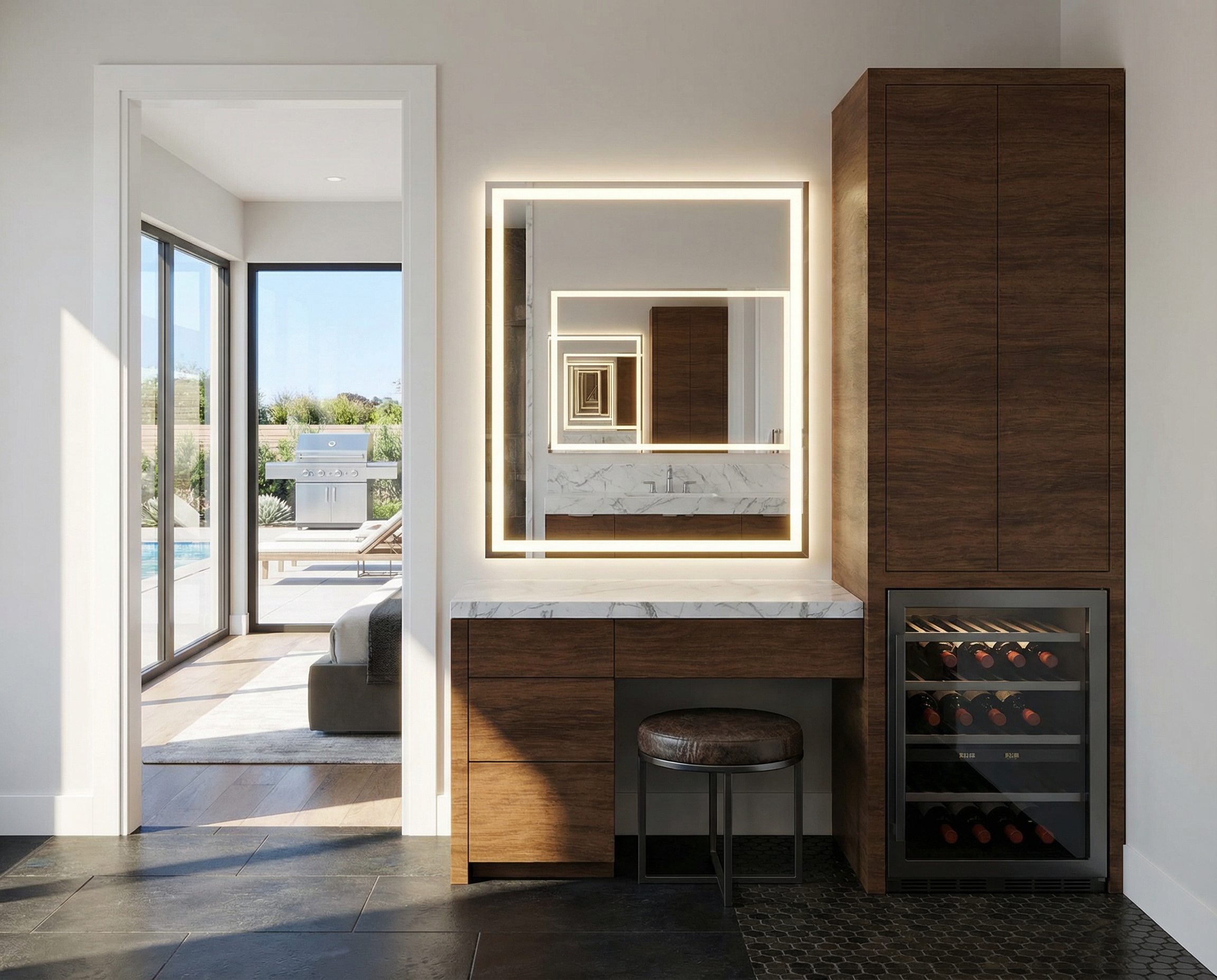 the mirror is glowing from behind with a soft led lighting and shower has a clear frameless glass the ceiling has recessed can lighting that perfectly illuminates the bathroom