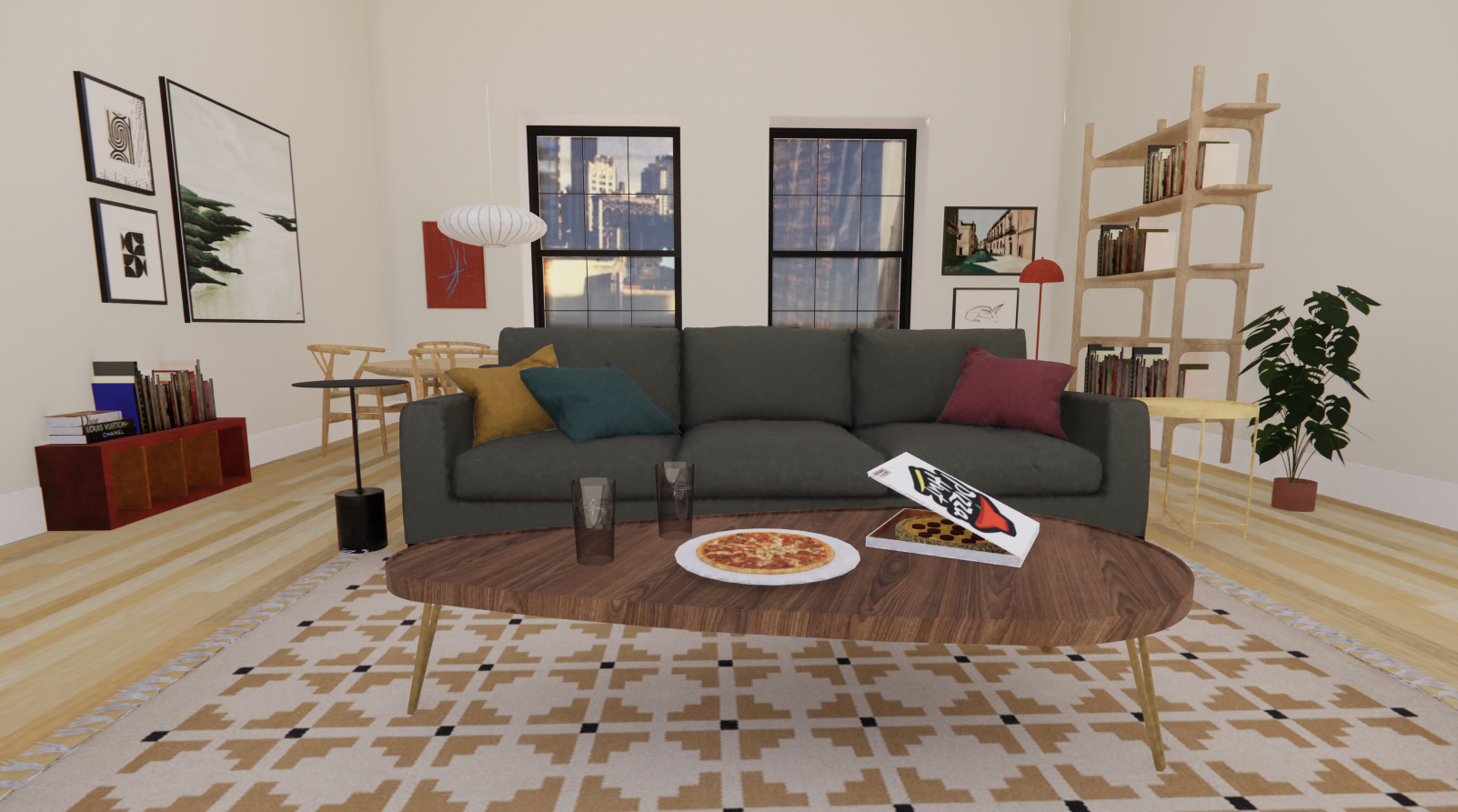 make this render realistic with sunset lighting coming from the windows