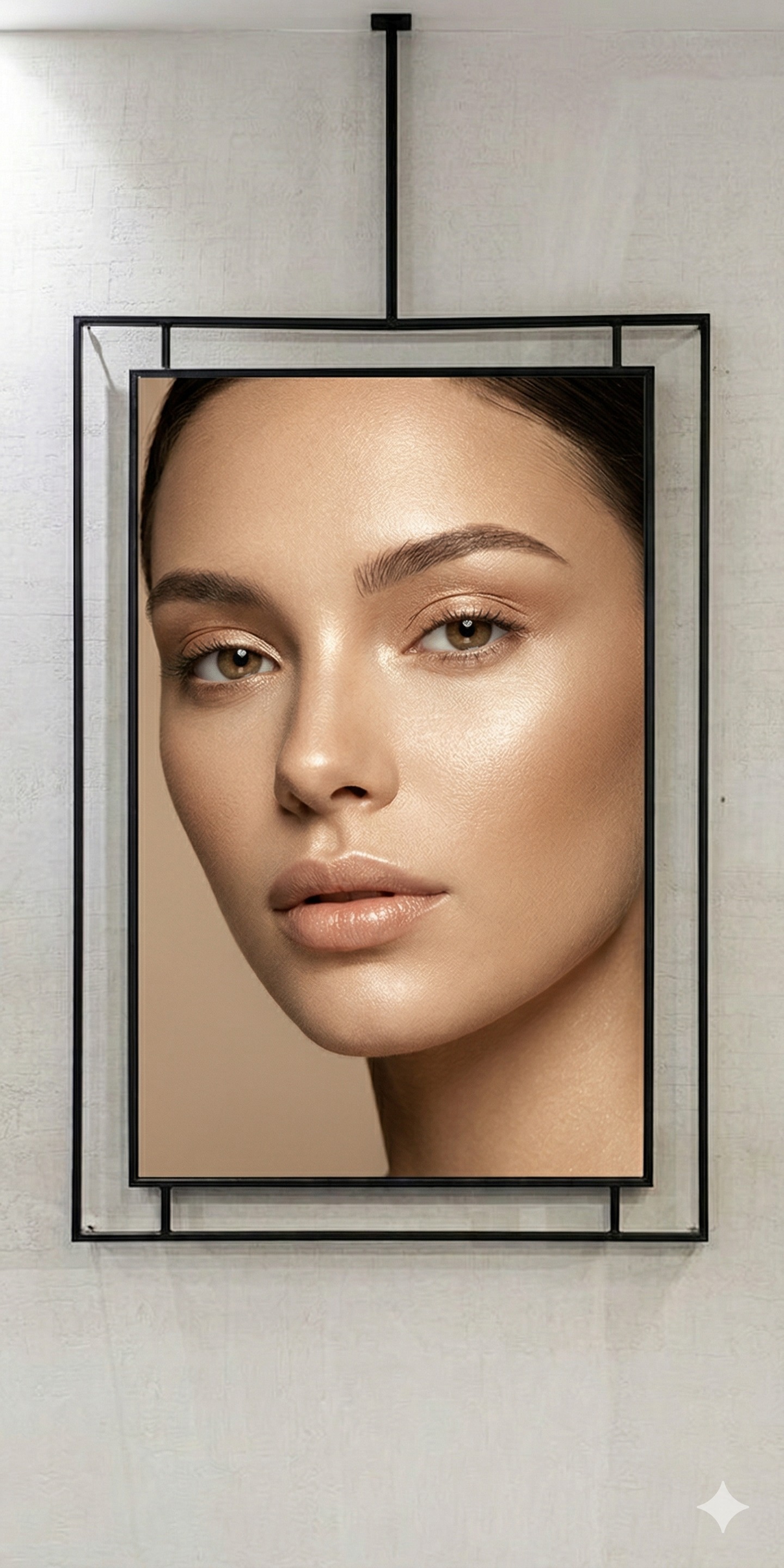 a refined elegant brass frame around an image of a beauty campaign without text frame should feel high end and elevated and highly detailed in an ultra modern minimal design