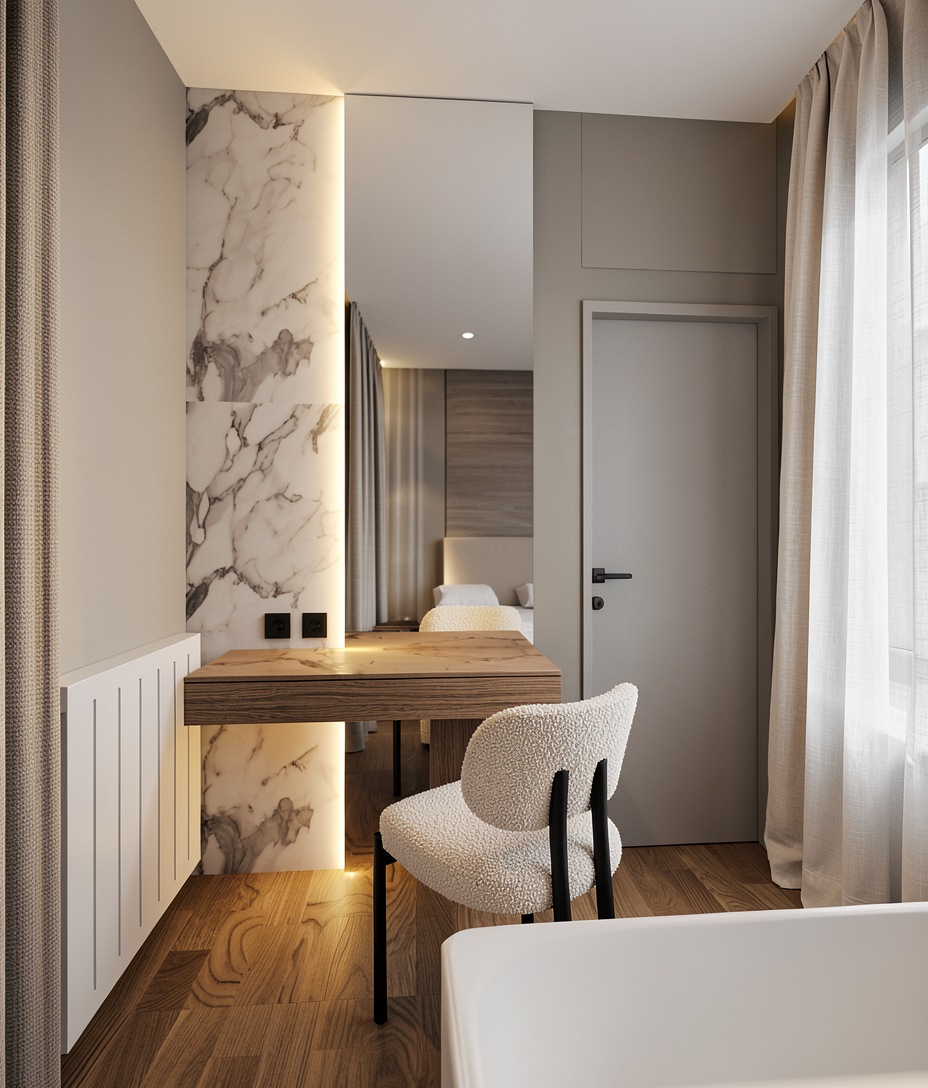 mirror includes concealed backlighting creating a soft indirect glow that enhances the atmosphere and adds depth to the composition keep the initial design the chair has boucle of white beige fabric with black metal legs daylight