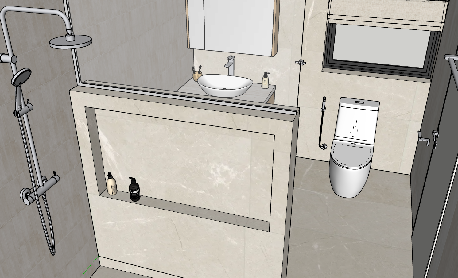 morning sunlight from window only only one window in bathroom ceiling light illumination soft illumination matt floor and wall finishes matt stainless steel finish warmer color hue white color door