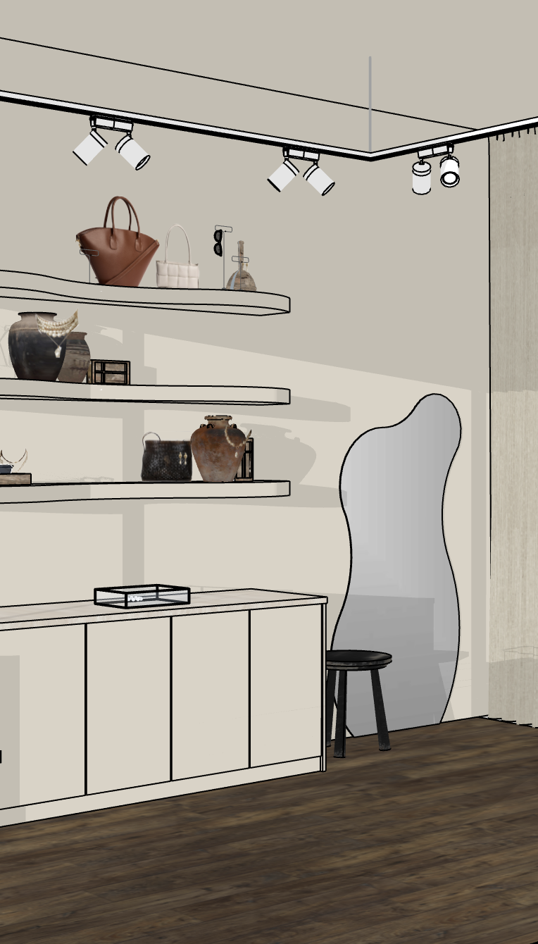 create real photo walls beige cabinets beige shelves beige counter top travertine old pots on shelves with pearl necklaces around them leather handbags on shelves antique chinese milking stool in corner