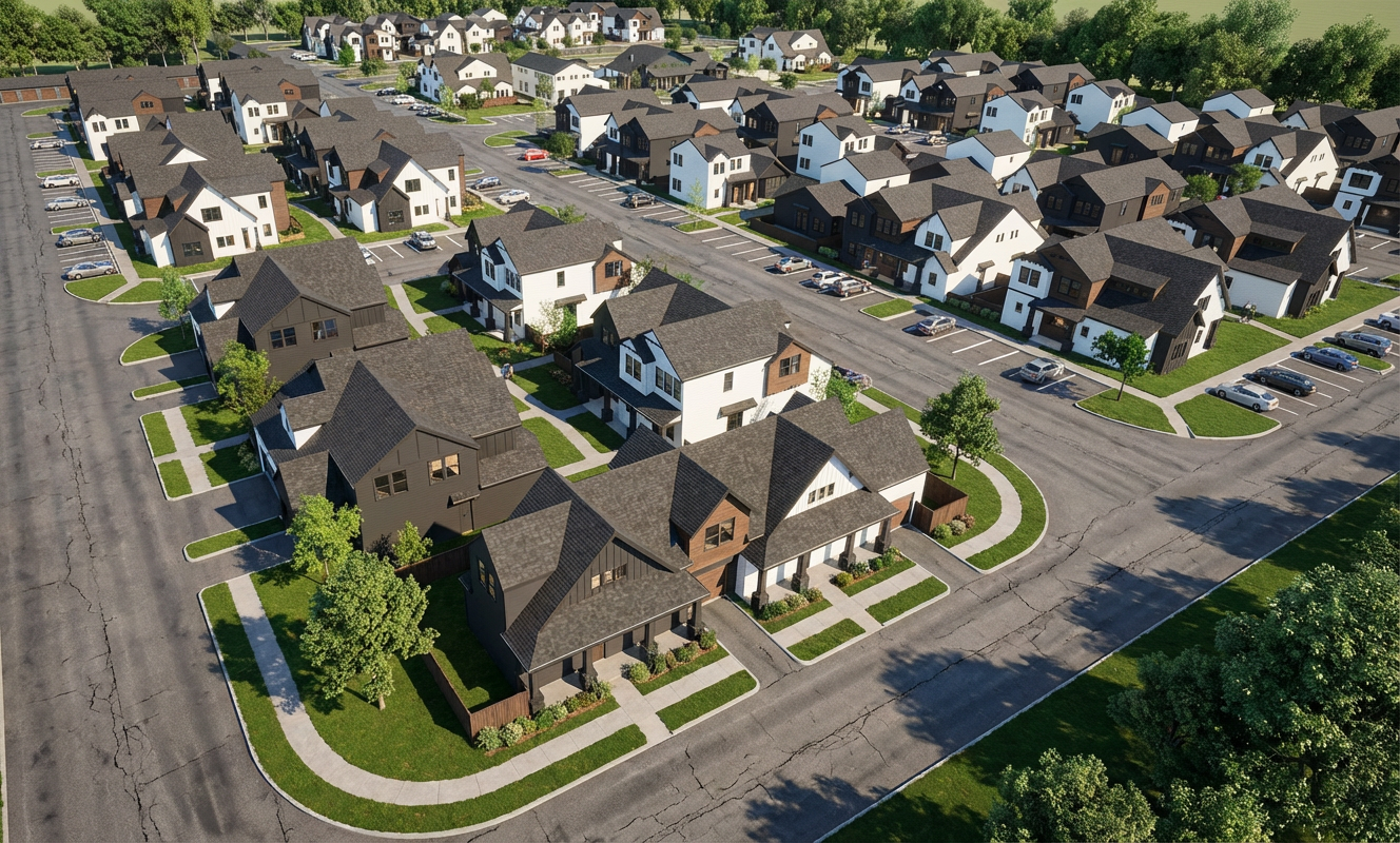 transform the provided architectural model into a highly photorealistic contemporary rustic luxury residence preserve the exact massing rooflines window locations proportions and architectural geometry of the input model do not modify or reinterpret the architecture material assignment must follow the model colors exactly all gray colored surfaces represent dark charcoal moss rock stone veneer with deep gray to charcoal coloration subtle cool undertones varied natural stone sizes irregular shapes recessed mortar joints and a matte non glossy finish the stone should appear rich dimensional and slightly shadowed never light beige chalky or limestone like all brown colored surfaces represent warm reclaimed vertical wood siding with golden brown tones subtle sun warmed highlights realistic grain variation and a natural oiled finish avoid gray ashy or desaturated wood tones all roof surfaces matte black standing seam metal roofing with soft realistic highlights all windows and doors black aluminum frames with subtle divided lites and neutral realistic glass reflections do not swap or reinterpret materials between colors do not lighten stone or cool the wood tones add realistic depth through accurate material thickness window reveals shadowing and trim detail maintain clean professional construction detailing suitable for high end residential marketing imagery landscape with a clean gently sloped lawn and restrained drought tolerant planting greens should be natural and slightly muted not oversaturated or overly lush lighting soft late afternoon daylight with gentle warmth sunlight should feel calm and high end with a slightly golden tone neutral to warm sky smooth realistic shadows and balanced exposure avoid dramatic sunset lighting harsh contrast overcast flat light or cinematic effects overall look ultra photoreal architectural visualization high material fidelity balanced warm cool contrast natural color grading similar to professional architectural photography no stylization no exaggeration no hdr glow camera eye level slight wide angle 30mm straight verticals composed as a professional exterior hero photograph