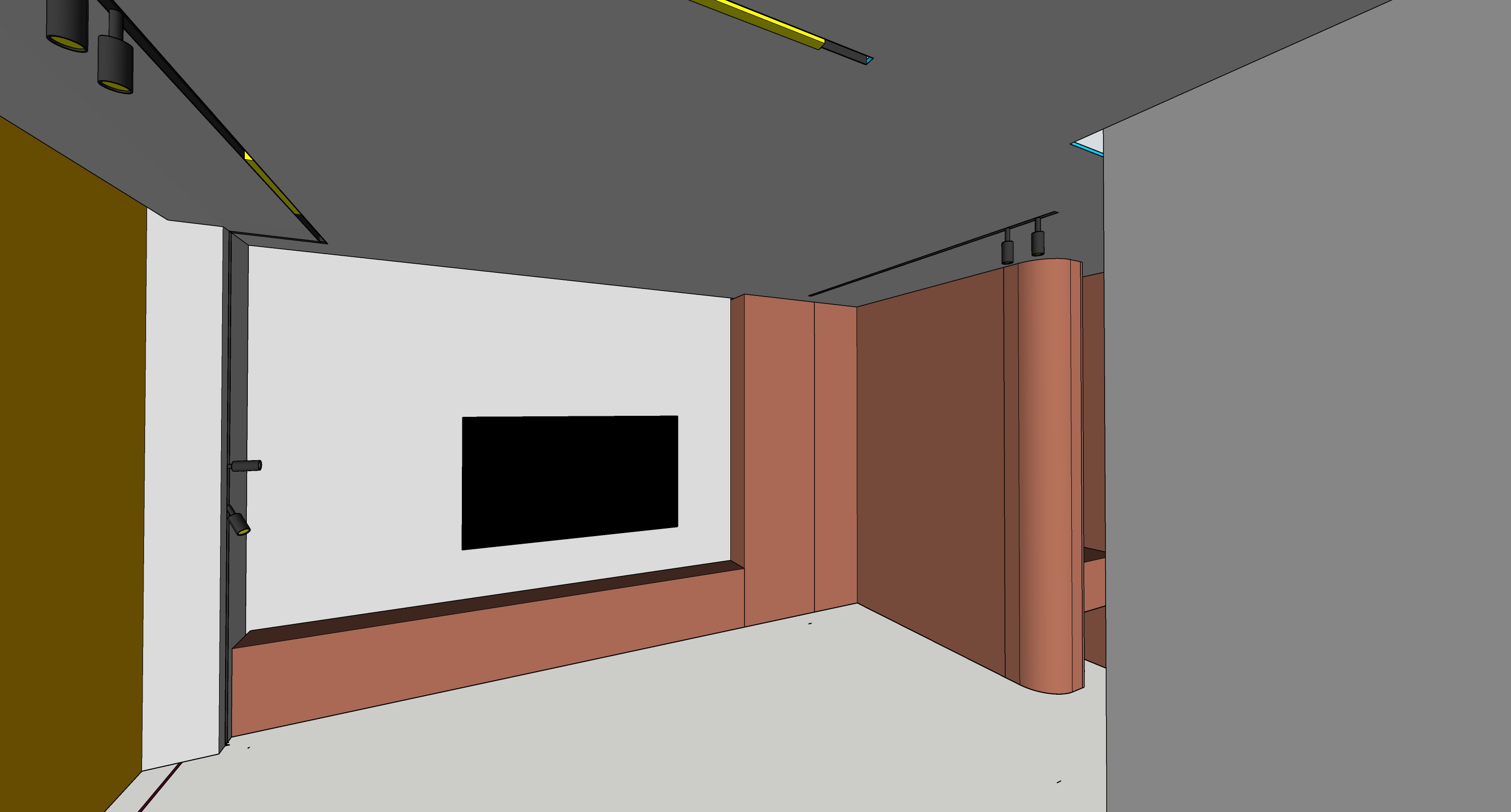 a modern interior space with sleek minimalist design featuring a warm terracotta accent wall complemented by a smooth white wall the ceiling is a deep charcoal gray with subtle lighting fixtures casting soft ambient light the floor is a muted light gray use brushed metal for handles and fixtures and incorporate golden brown hues for the adjacent wall to create a warm and inviting atmosphere