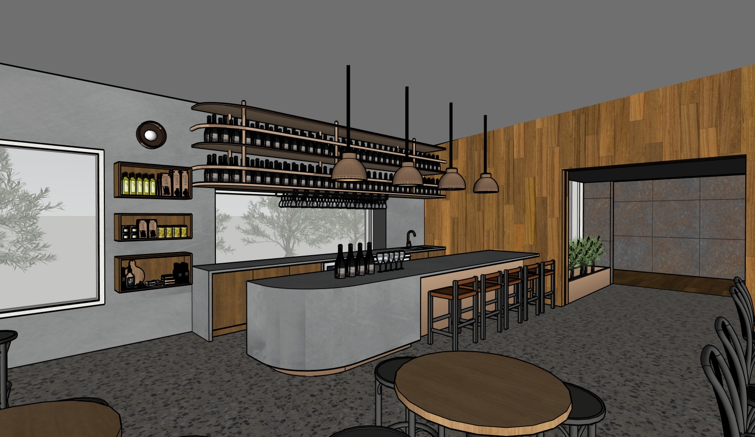 photorealistic interior photography style natural dynamic range balanced exposure slight softness in highlights realistic material imperfections shot as if on a professional full frame camera with natural interior lighting lower window brightness reduce overexposed exterior light items in boxes next to the bar are bottles and jars and food stuffs object above these shelves is a copper wall light