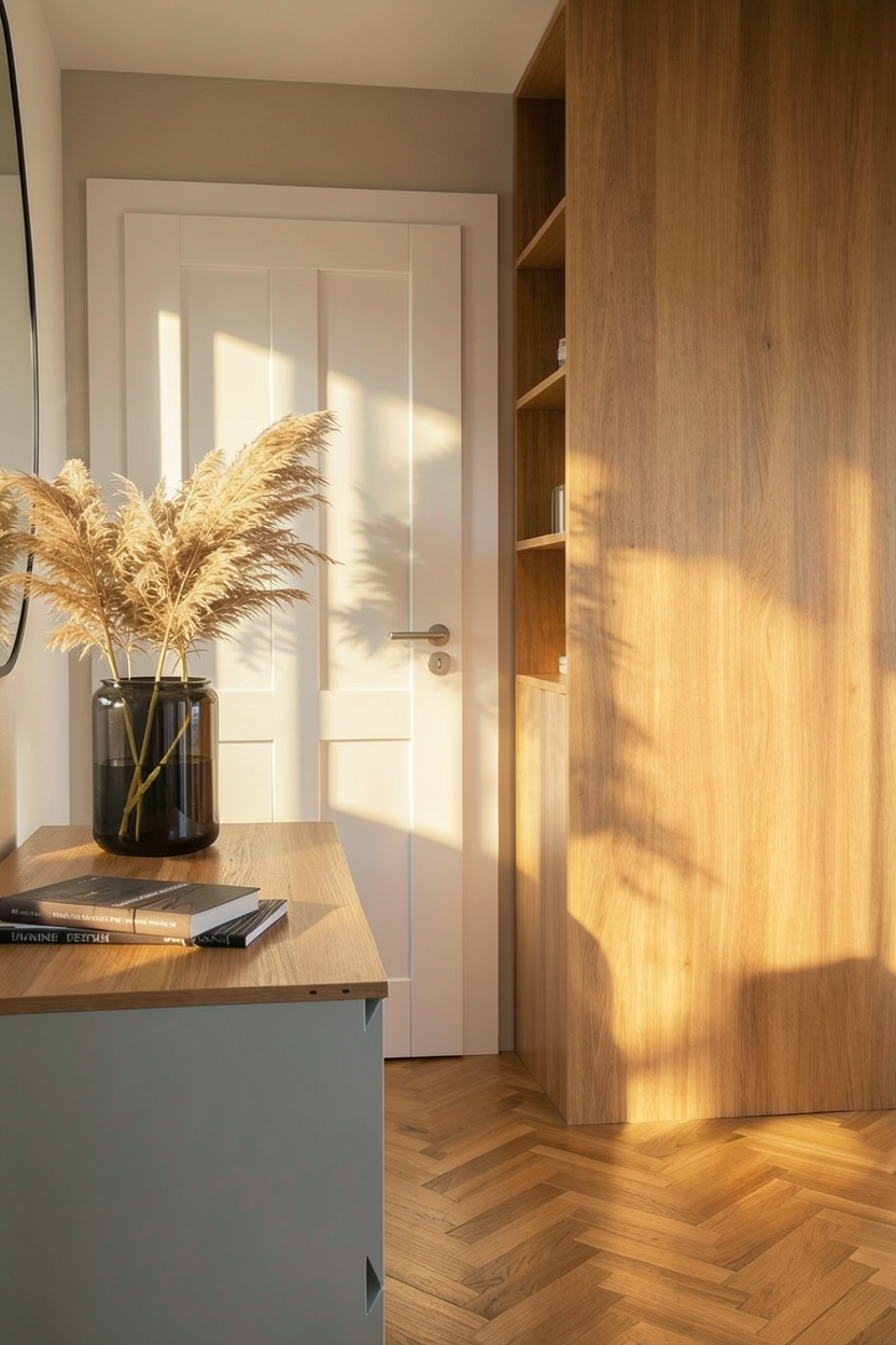 create ultra realistic images without changing any structure shape design or material do not resize the jpeg do not change the color of material use soft wood texture for the floor and add indirect light to the shelves and add decorations and use light beige color for wall paint add indirect light to the curtain valance and do not change the materials
