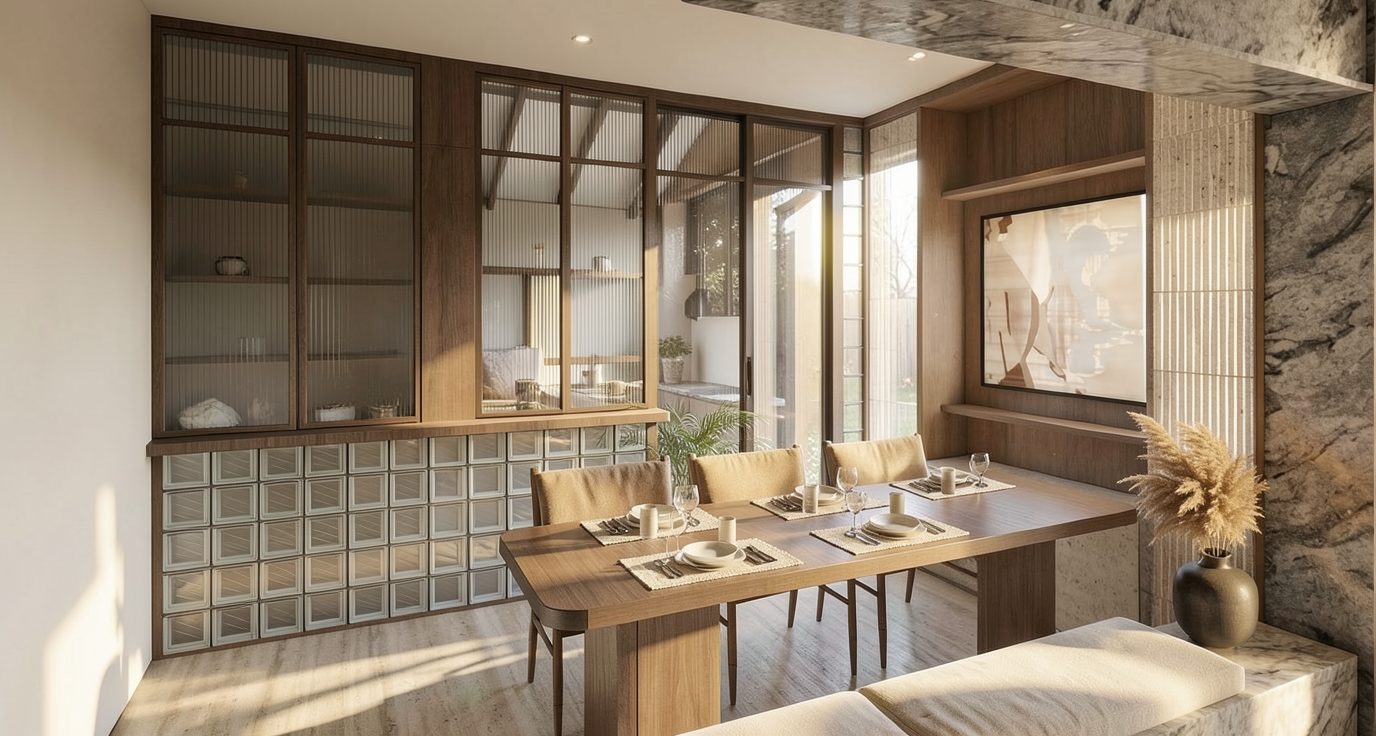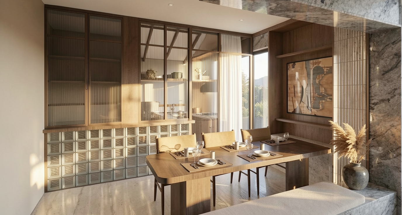 terrazza con divano in tessuto bianco caldo tavoli e tavolini in legano teak e cucina con piano di lavoro fianchi e mensola in gr s effetto pietra gli sgabelli e gli elettrodomestici della cucina sono cromati la mensola della cucina ha una strip led sotto che illumina il piano di lavoro sotto ai due gradini della pedana in legno della vasca idromassaggio ci sono delle strip led attorno alla vasca idromassaggio ci sono delle siepi metti uno sfondo con case con chiome di alberi e colline in lontananza metti qualche oggetto per ambiente conviviale esterno