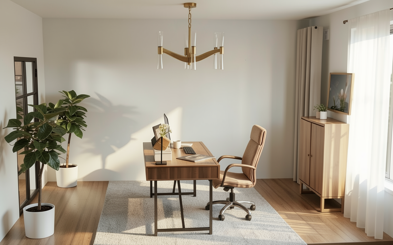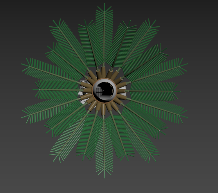 photorealistic render of a radial palm canopy structure green grp glass reinforced plastic palm leaves with subtle fiberglass texture and semi matte finish brown grp central stem hub realistic molded material soft studio lighting natural reflections soft contact shadows high detail neutral dark grey gradient background professional product visualization 8k quality