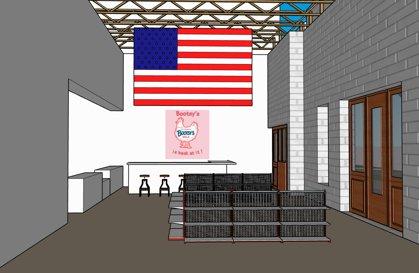 make this a photorealistic rendering of a new bar serving beer that has a chicken logo