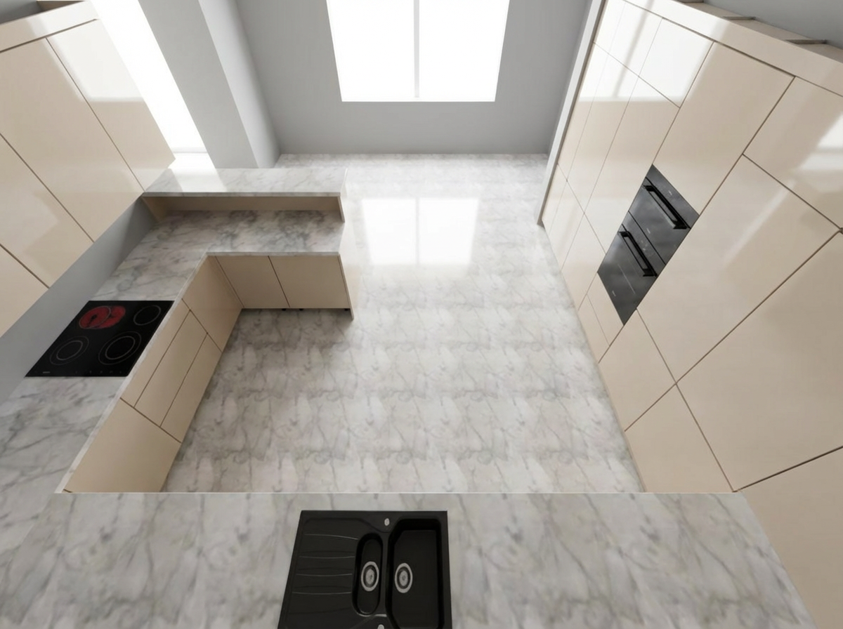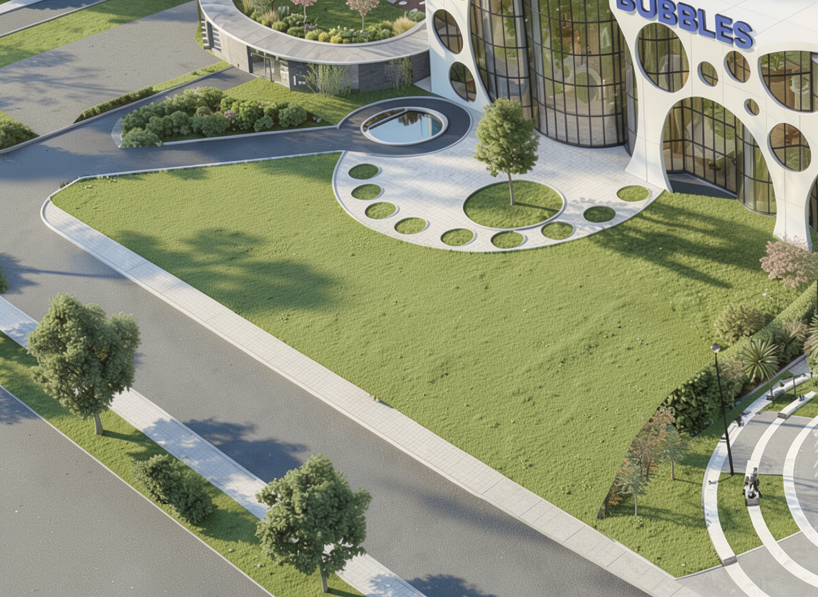 contemporary mixed use building in a european urban context minimalist architecture with a combination of light concrete vertical wooden cladding and dark metal panels clean geometric volumes large grid windows recessed top floor with wooden soffit ground floor with transparent glass fa ade and visible interior activity people walking and interacting in a public square soft natural daylight slightly overcast sky subtle shadows birds in the sky surrounding low rise buildings with brick and wood textures distant hills in background calm atmosphere photorealistic high detail architectural visualization wide angle view cinematic composition neutral color palette soft contrast 35mm lens