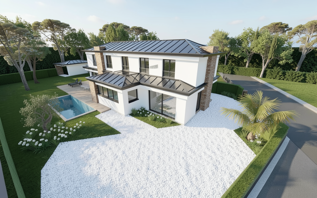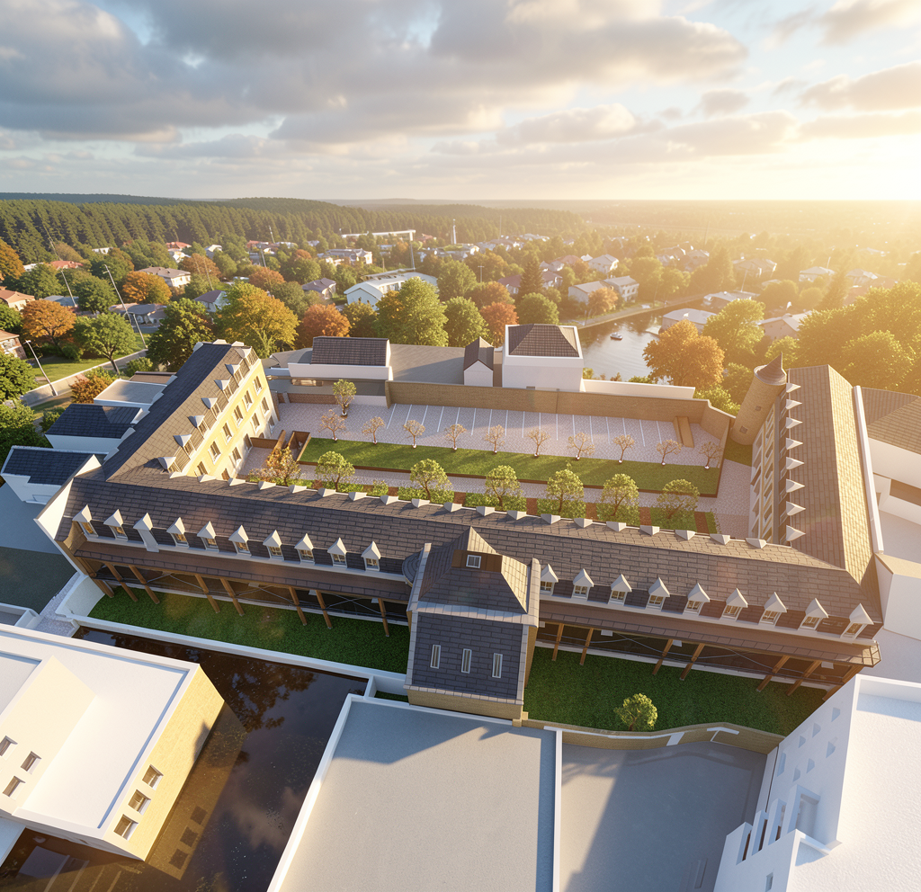 photorealistic aerial render of a luxury wellness cabin resort based on this masterplan roughly twenty dark stained timber cabins with flat or shallow pitched roofs arranged across a gently sloping grass hillside each cabin set within its own landscaped circular clearing winding organic pathways connect all cabins across the site a large circular spa and wellness pavilion with a timber clad drum building sits centrally beside a natural free form lake with curved stone edging a hot tub and circular bathing terrace sits on its own island mound to the left of the lake the hillside rises behind the resort covered in wild grass and mature native trees oak birch rowan and scots pine replacing all the coloured marker posts with full canopy trees lush planting between cabins soft mounded grass berms separating each plot northern ireland countryside overcast dramatic sky with breaking cloud and shafts of golden light autumn palette amber rust deep green shot from a slight elevated drone angle matching this sketchup view hyper photorealistic editorial quality hasselblad h6d 50mm f 2 8 8k resolution unreal engine 5 render quality ar 16 9 style raw stylize 850 v 6 1