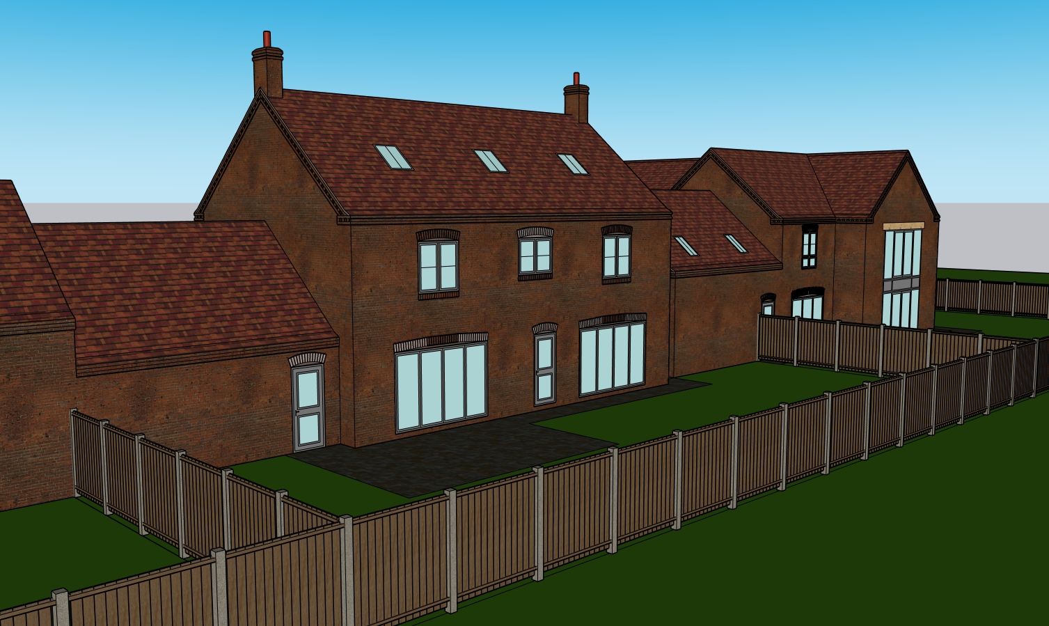 classical exterior shot create an artist imperssion with light cloudy sky summer golden hour light grey windows and doors red roof pan tiles red brickwork add landscaping architecture